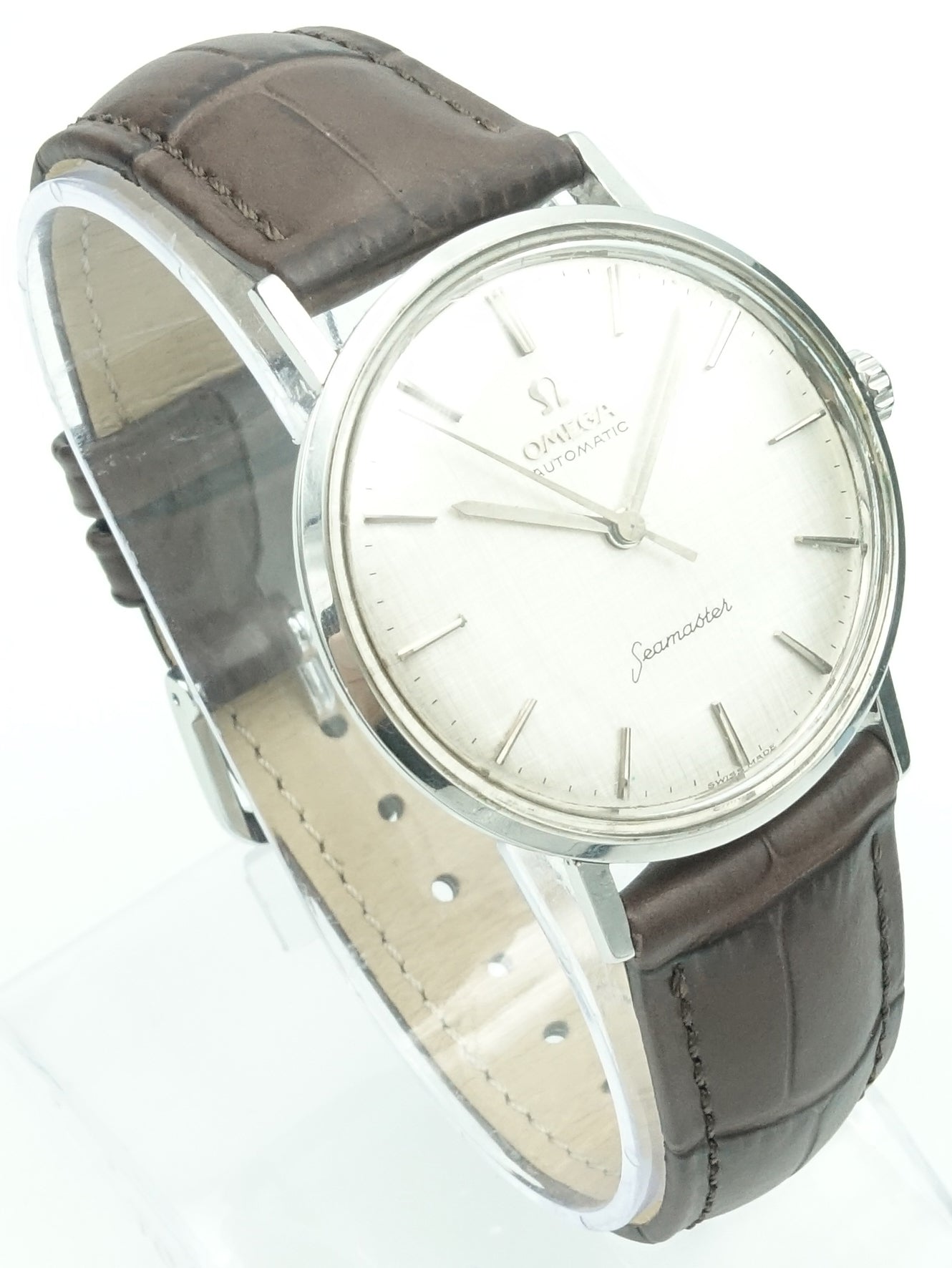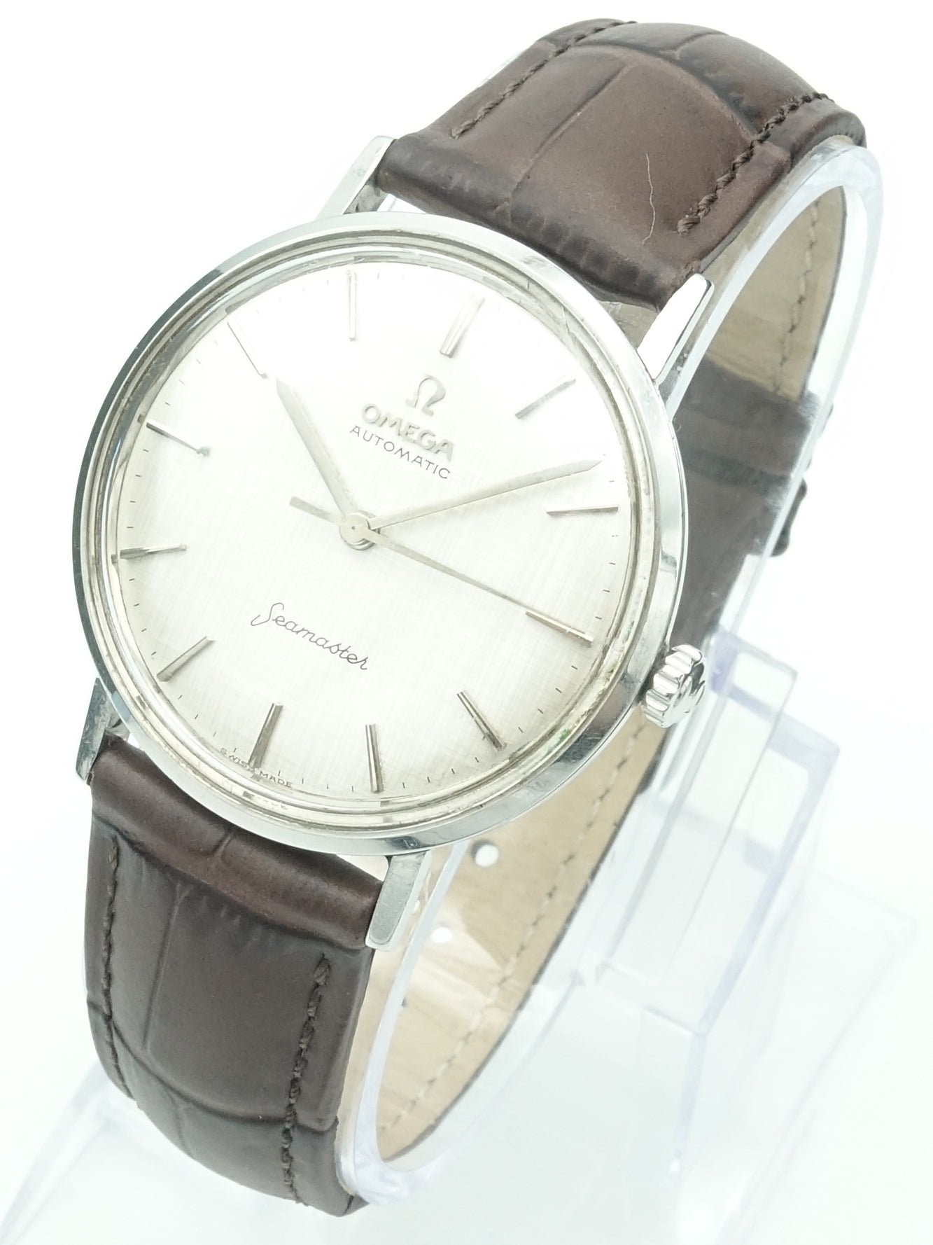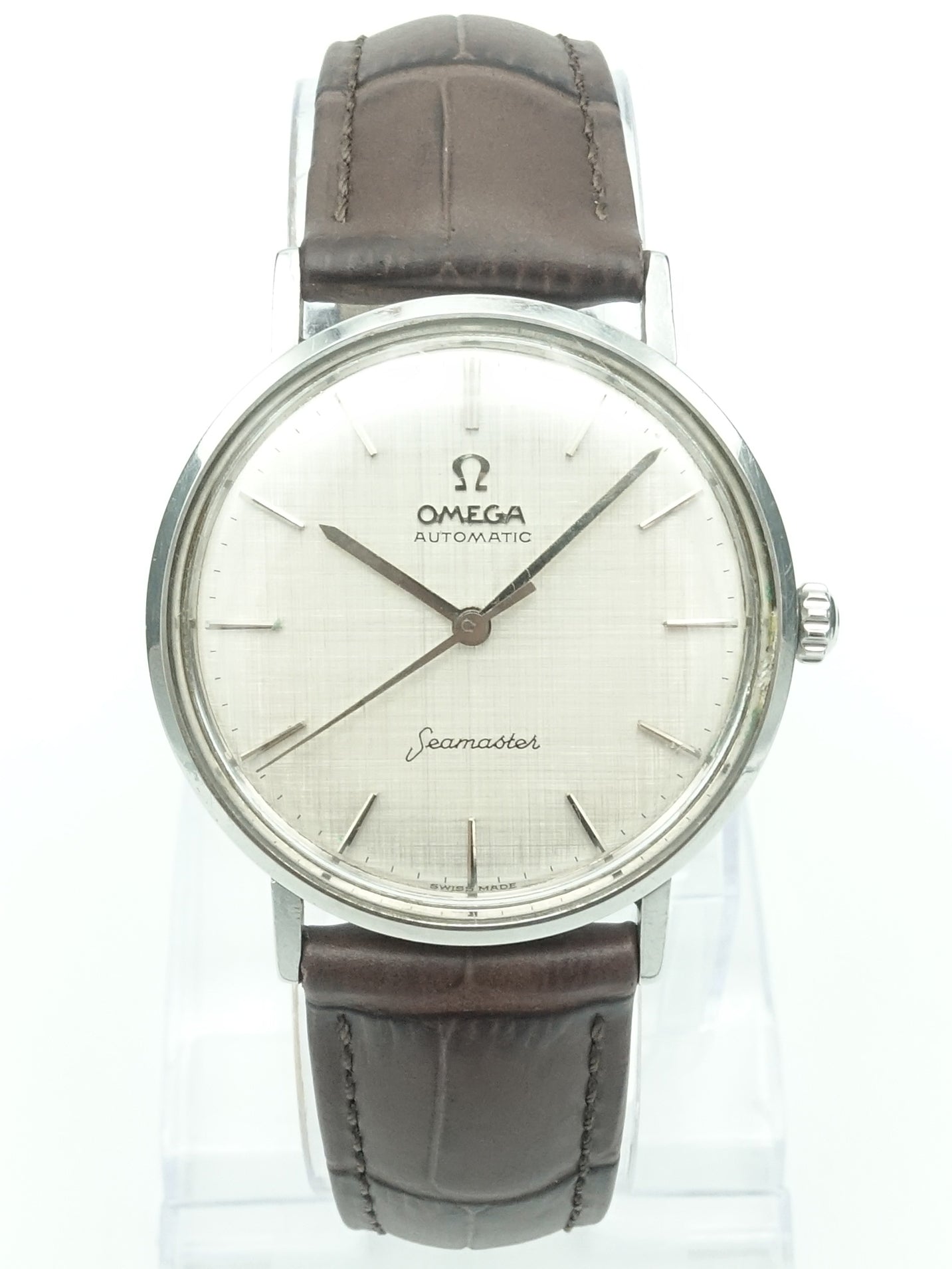 Introducing the 1960 Omega Seamaster Ref. 14765, a true testament to Omega’s mid-century craftsmanship. This classic model features a 34mm stainless steel case that remains sharp and well-preserved, showcasing elegant proportions that define the era. Most notably, it houses an incredibly rare linen effect dial—an intricate, textured pattern that adds depth and uniqueness to the overall design.