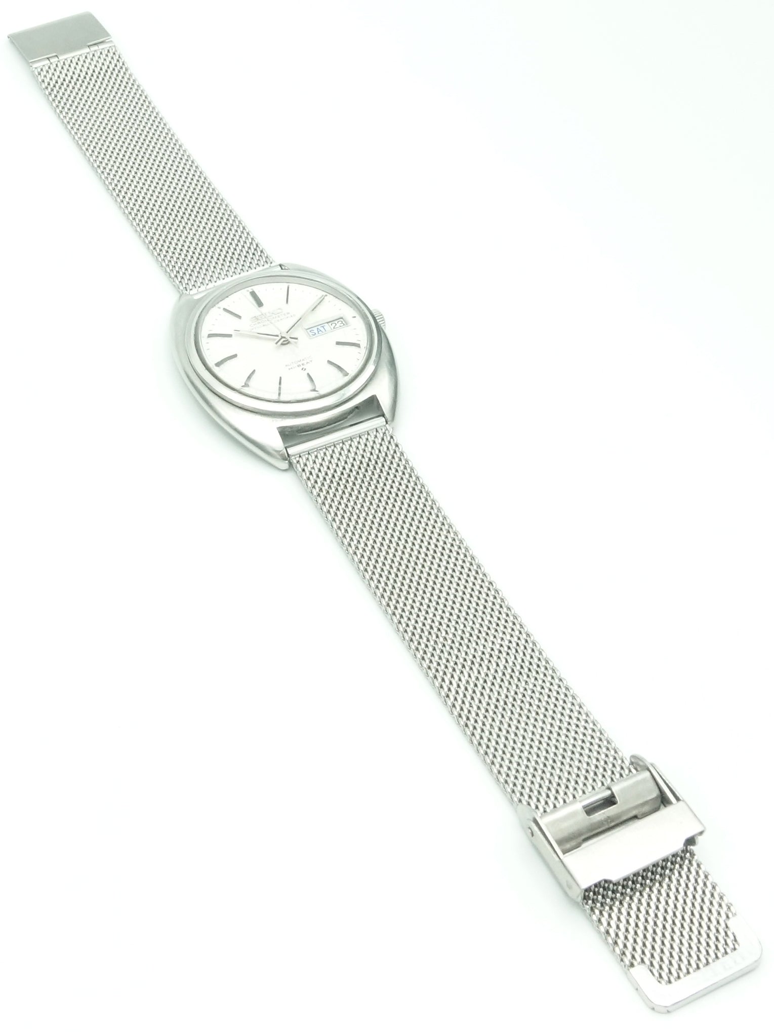 Enhancing its vintage charm, this particular piece is fitted with a stainless steel mesh bracelet, offering both comfort and a distinctive aesthetic that complements the watch’s overall design. The Seiko 5626-7090, with its rare dial, chronometer-certified movement, and unique branding characteristics, stands as a valuable addition for collectors and enthusiasts alike.