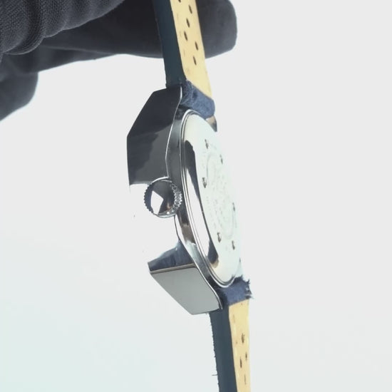 Rather than using traditional hands, the watch displays the time through a jump hour complication, with the hours appearing through an aperture while the minutes are indicated on a rotating scale. This unique display gives the dial a clean and futuristic appearance, perfectly capturing the innovative spirit of 1970s watchmaking. The watch is fitted on a blue suede strap which complements the vintage aesthetic and adds a touch of character.