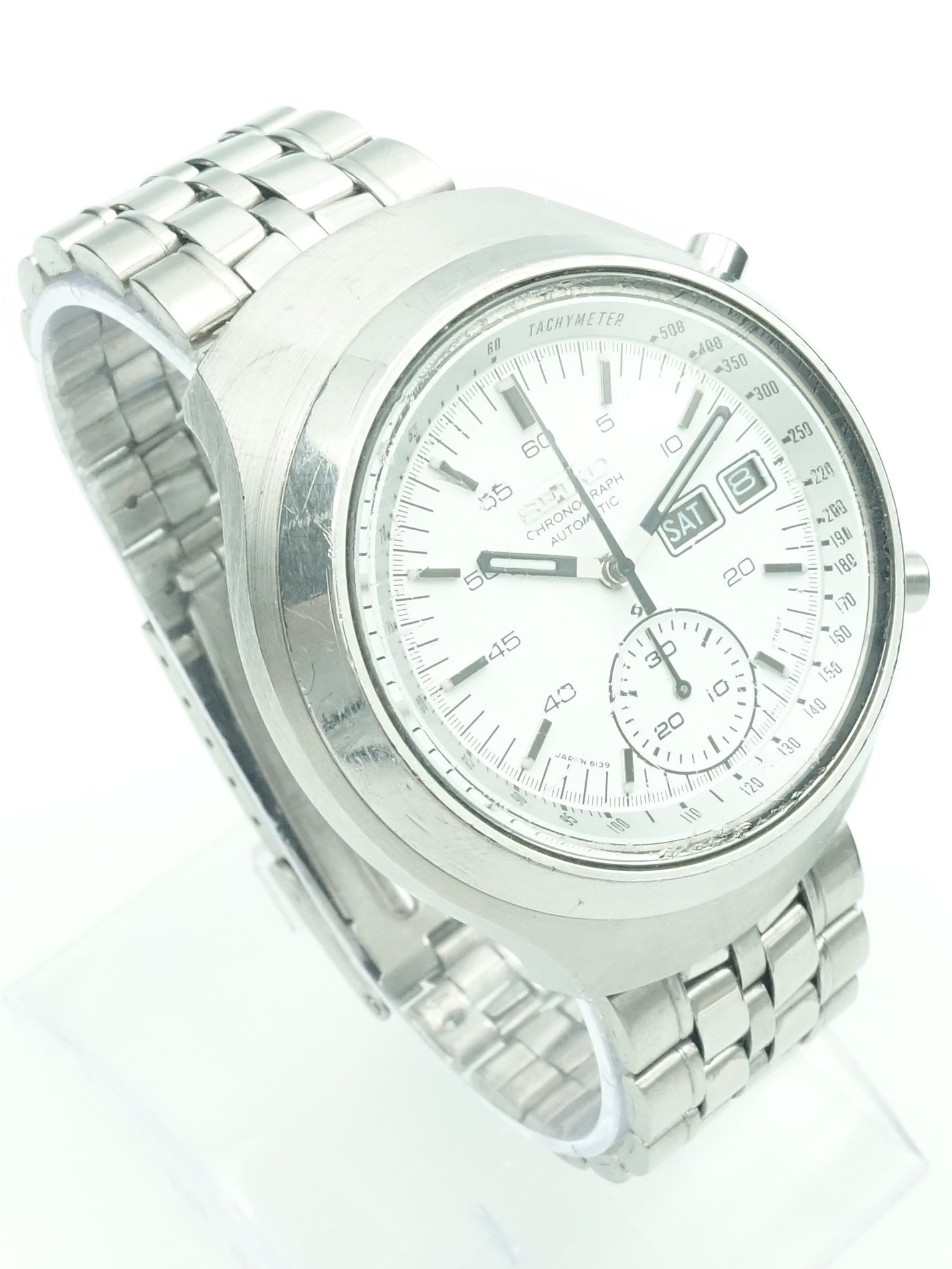 Inside, the watch is powered by Seiko’s automatic Calibre 6139, one of the world’s first fully integrated automatic chronograph movements. Known for its durability and reliability, it remains a favourite among enthusiasts. Combined with the helmet case and the rare “Stormtrooper” white dial, this reference represents a charismatic and collectible piece of Seiko’s chronograph heritage.