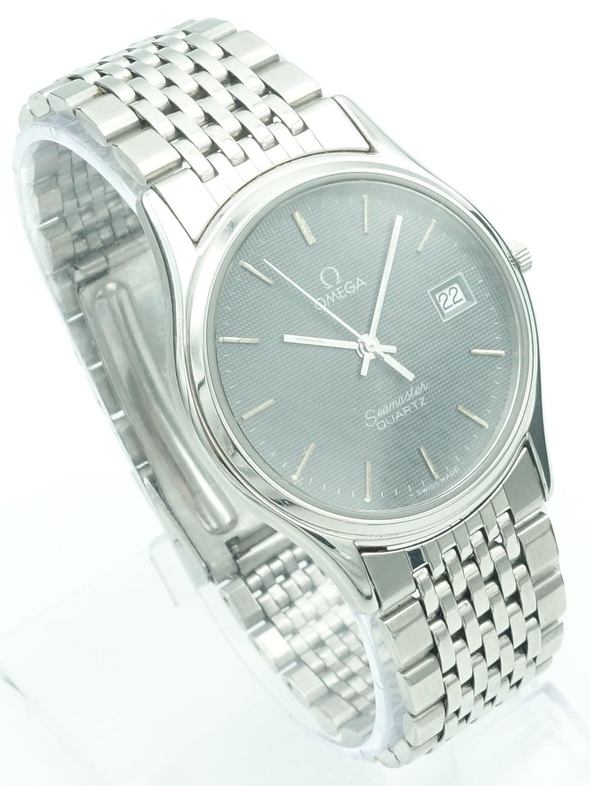 The 1982 Omega Seamaster Quartz Ref. 196.0251 is a refined example of Omega’s commitment to precision and design during the quartz revolution. This model features a 34mm stainless steel case that maintains a sleek profile, complemented by a rare grey textured dial. The intricate pattern of the dial adds depth and sophistication, making it a distinctive choice for collectors.