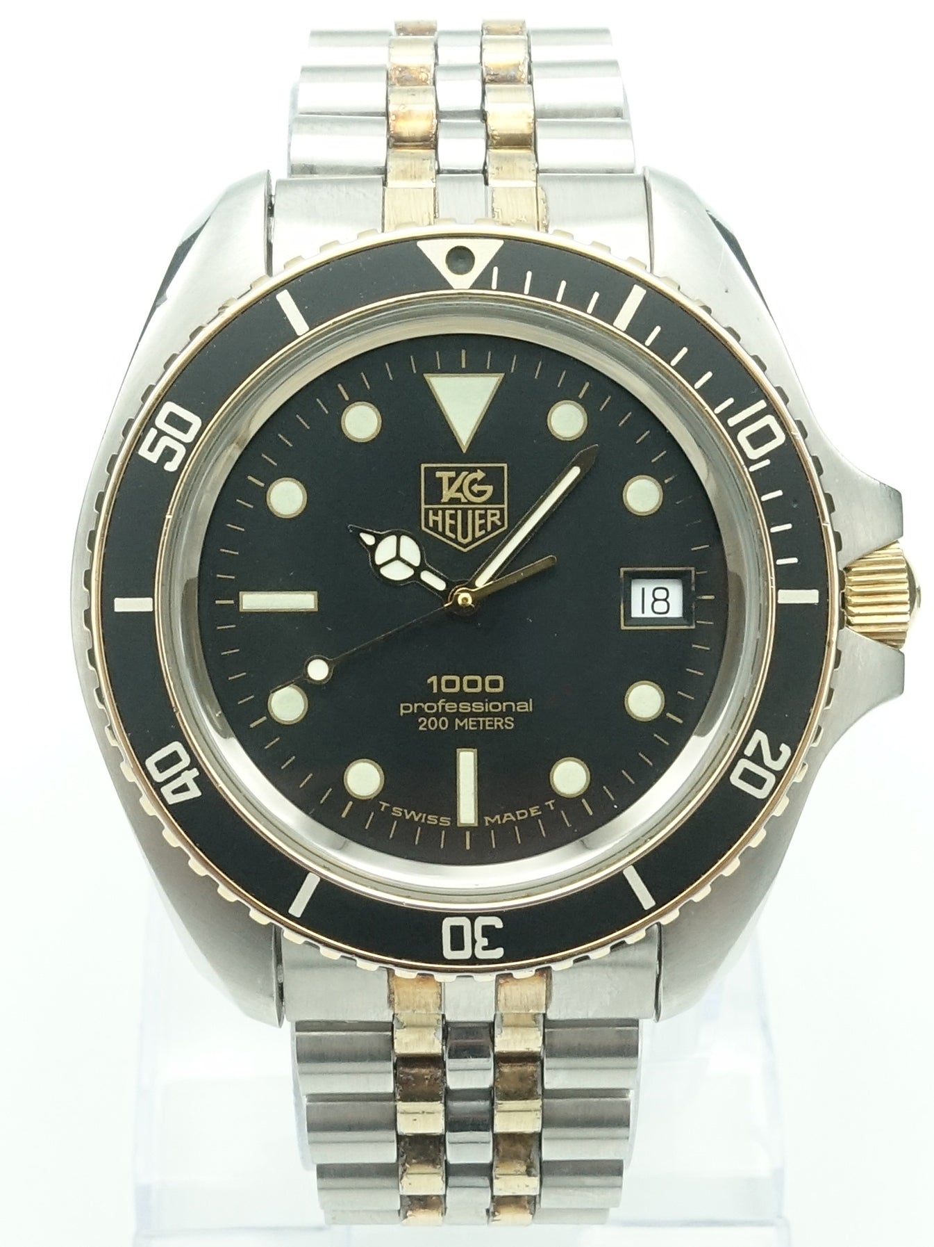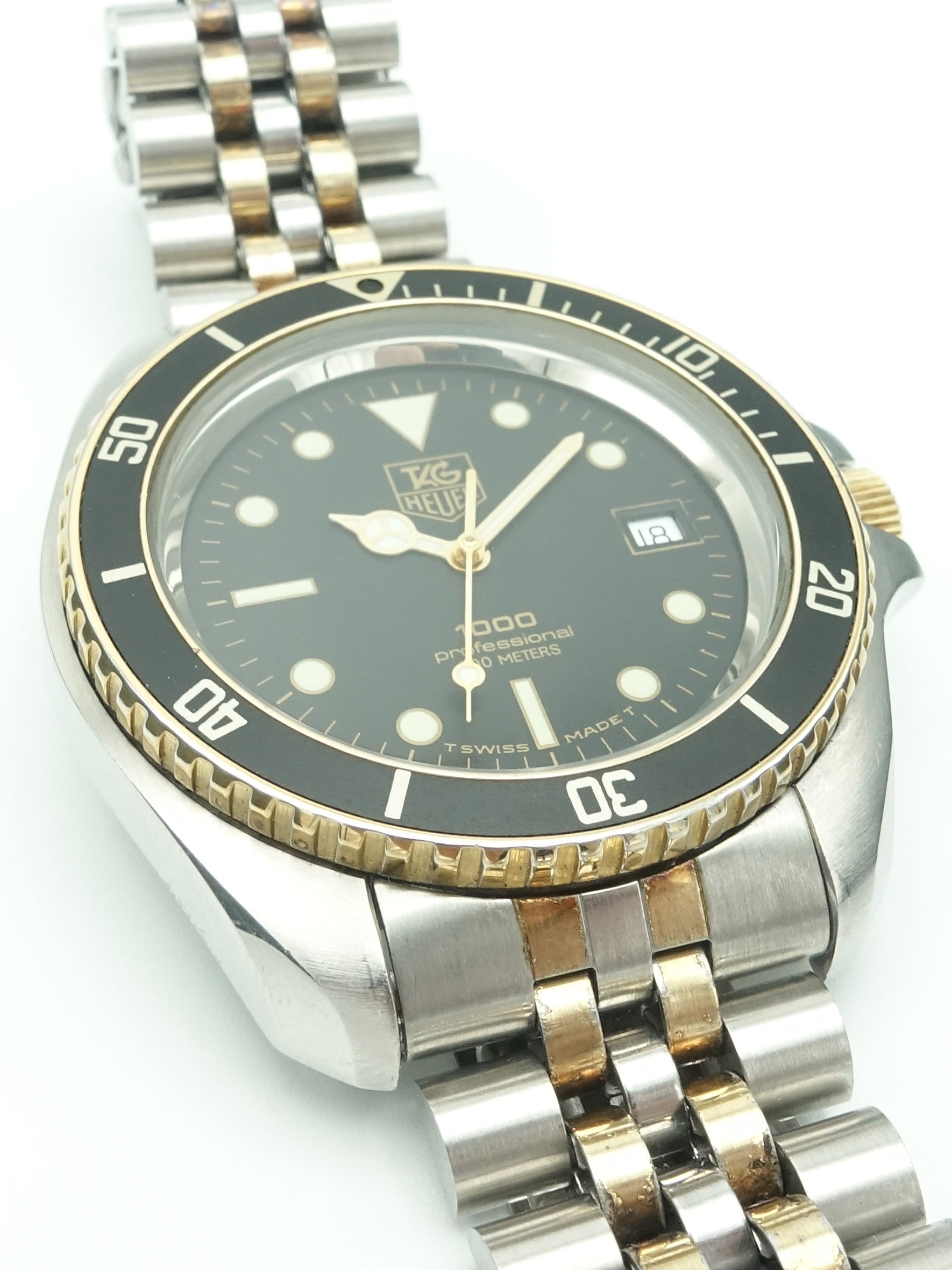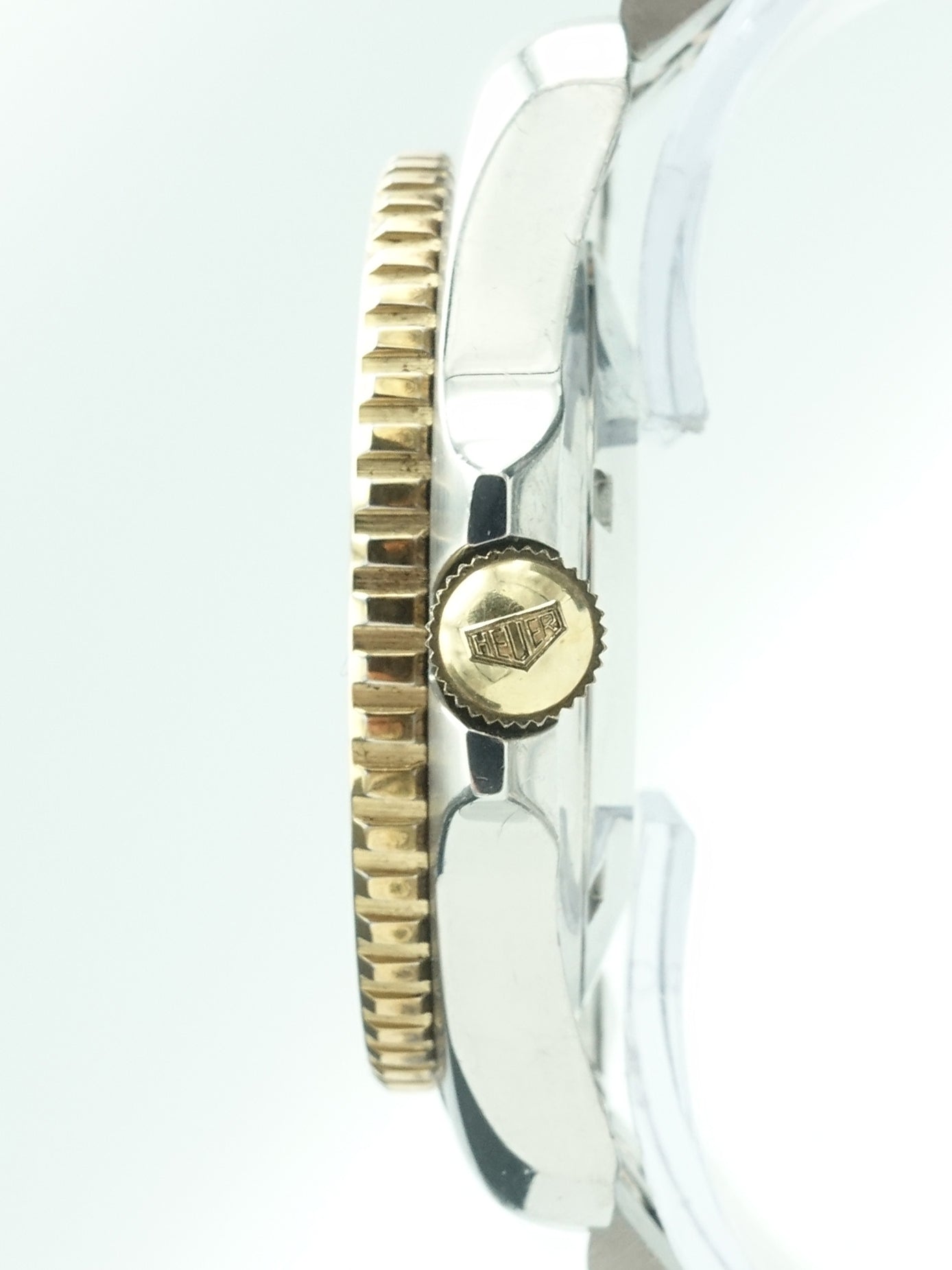 The 1985 Tag Heuer 1000 Ref. 980.021L is the larger and rarer two-tone version of the iconic diver, featuring a 42mm stainless steel case accented with gold-tone details. At a time when smaller watches were the norm, this oversized model saw limited production, making it a prized find among collectors today.