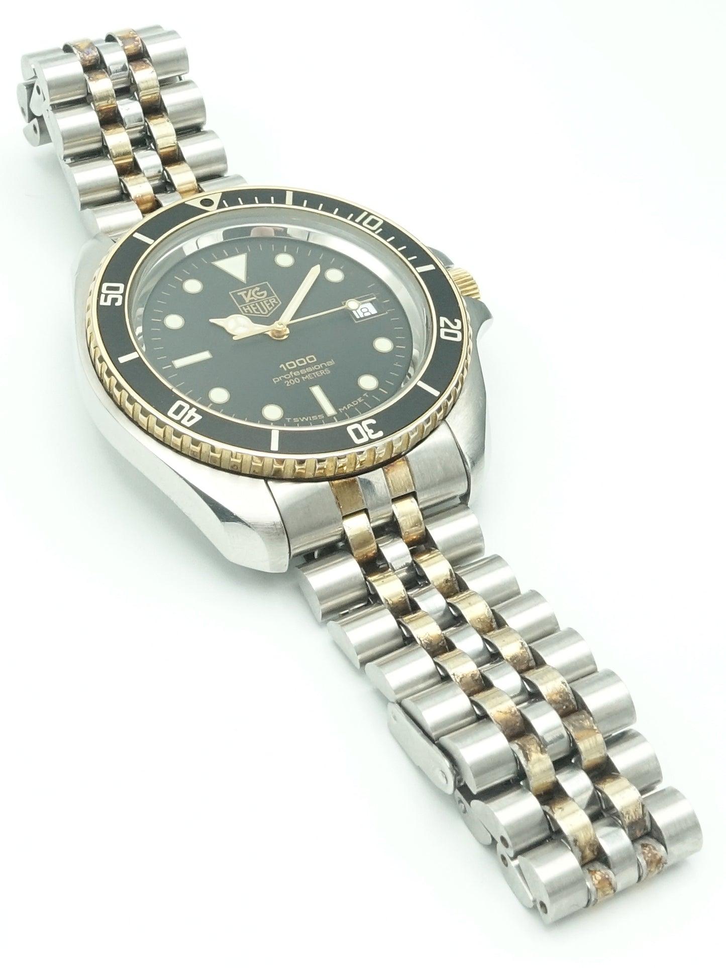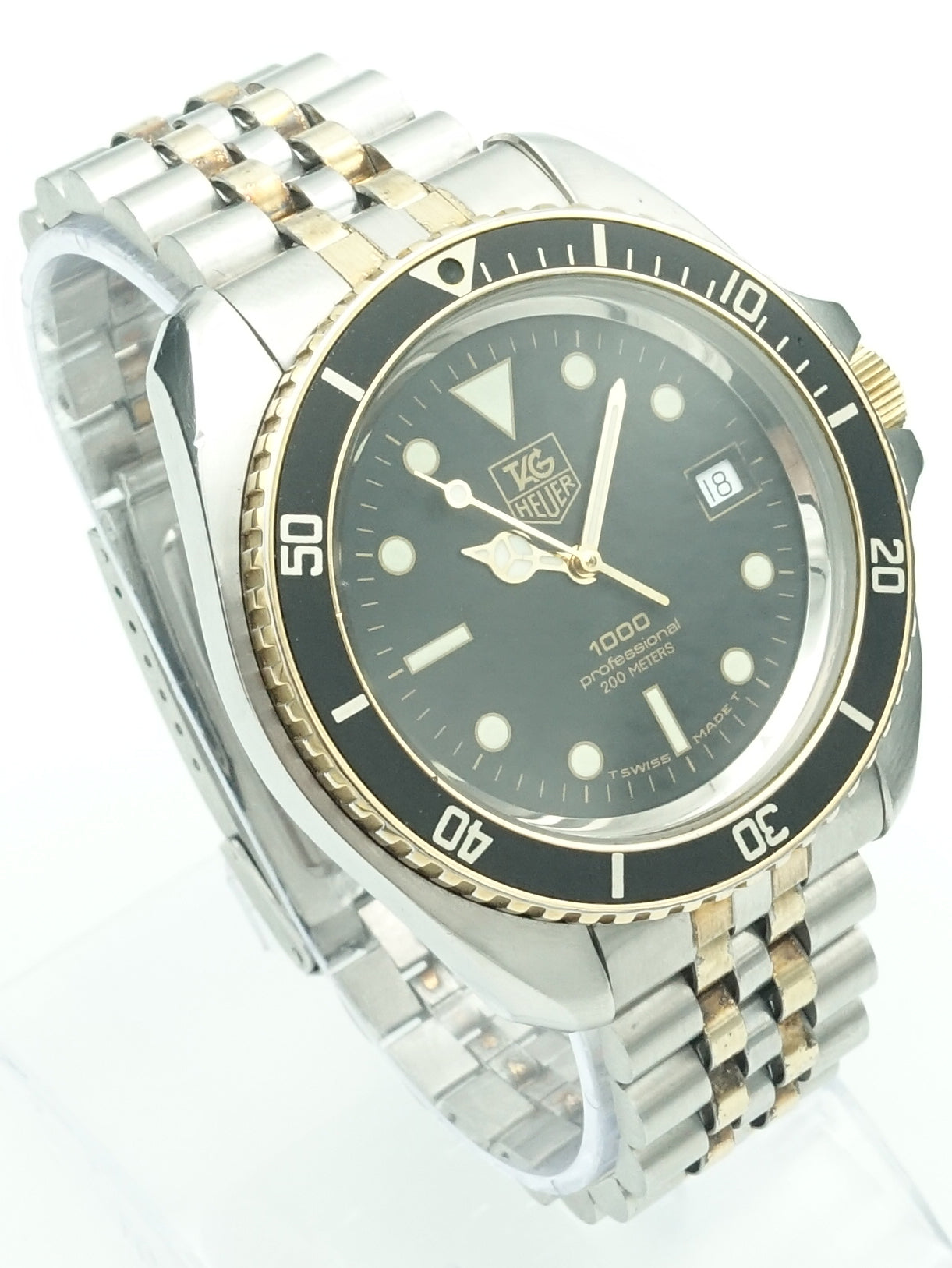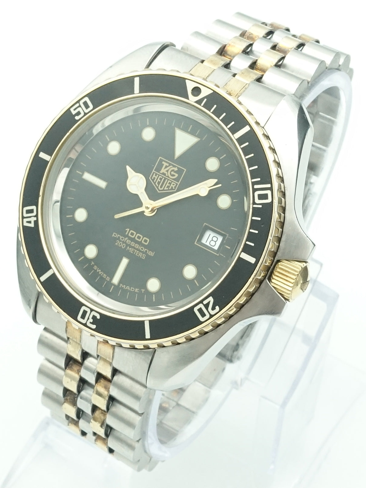 The 1985 Tag Heuer 1000 Ref. 980.021L is the larger and rarer two-tone version of the iconic diver, featuring a 42mm stainless steel case accented with gold-tone details. At a time when smaller watches were the norm, this oversized model saw limited production, making it a prized find among collectors today.