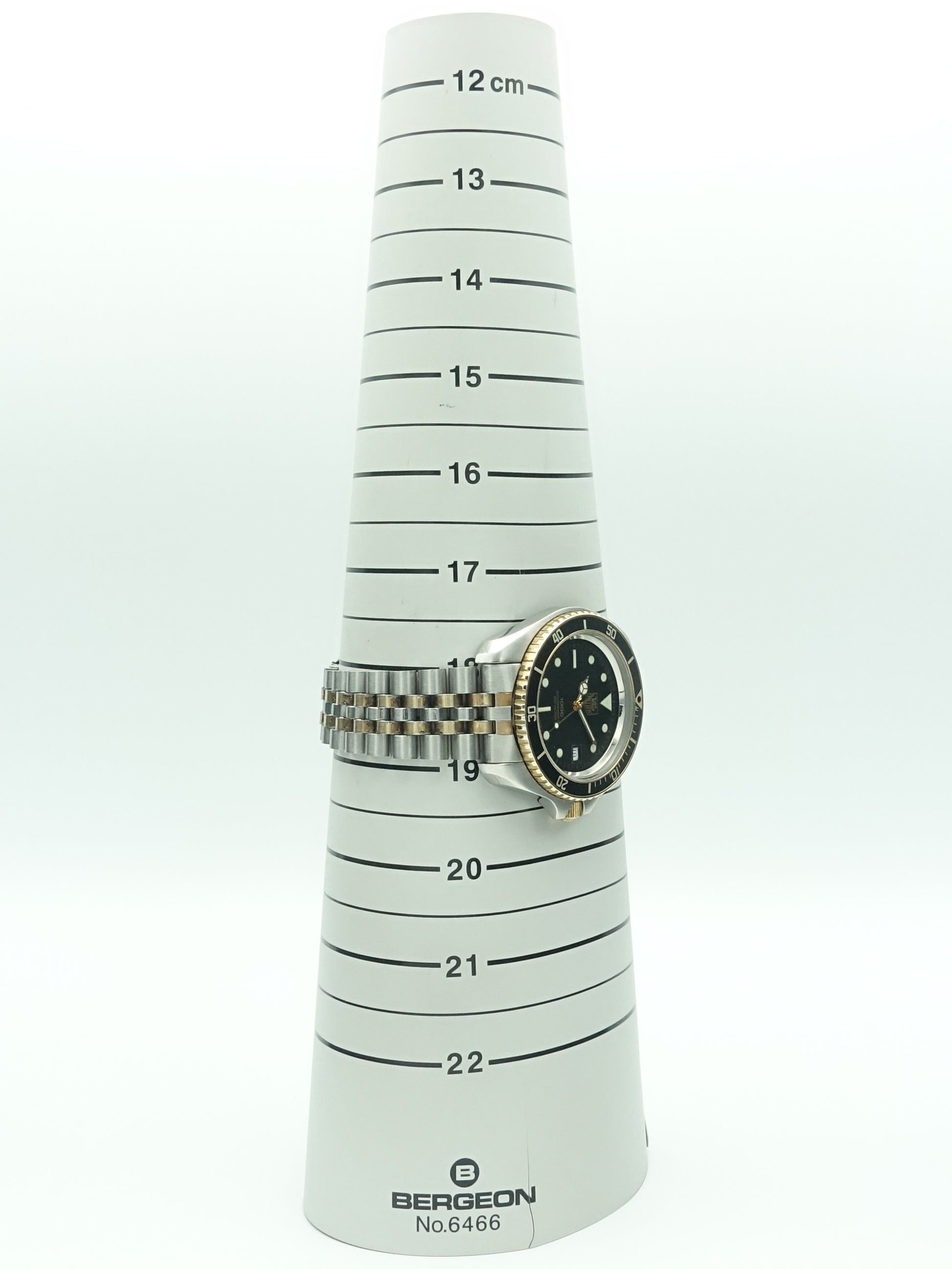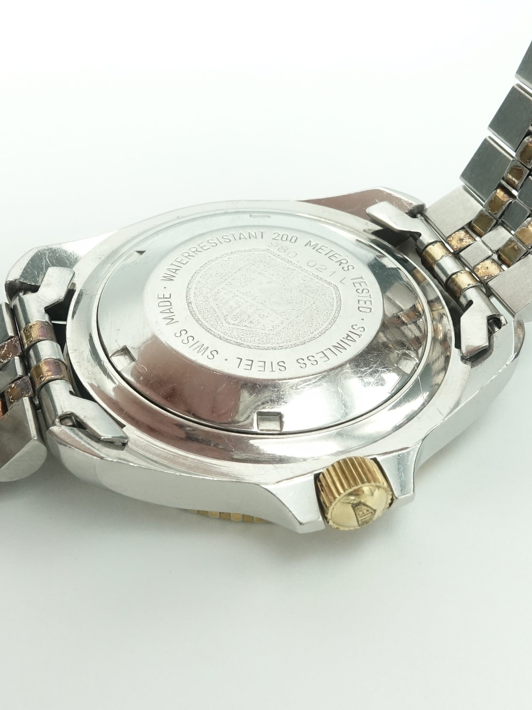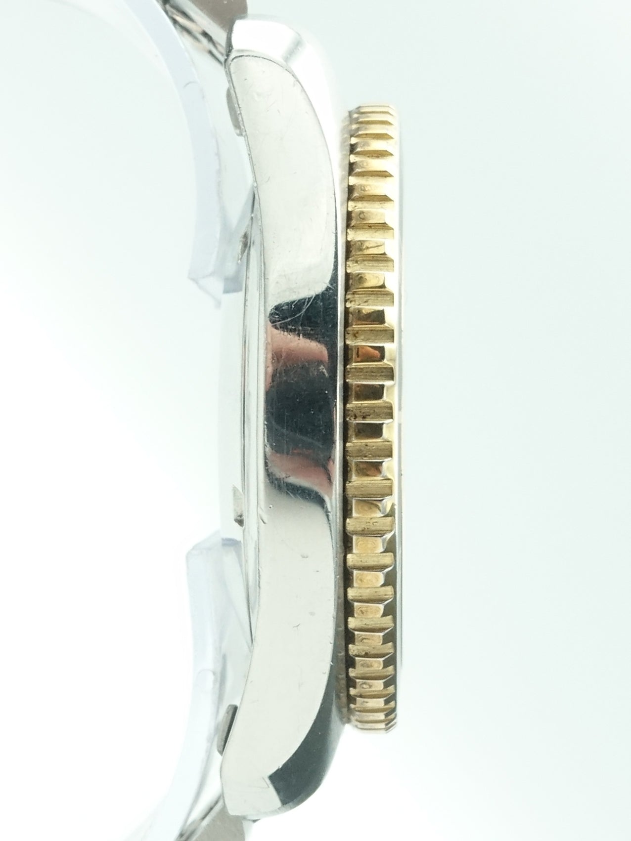 Fitted on a stainless steel bracelet, the two-tone finish continues through the center links for a cohesive look. Powered by a reliable quartz movement, this watch combines vintage dive functionality with bold 1980s style—perfect for those seeking something distinctive.