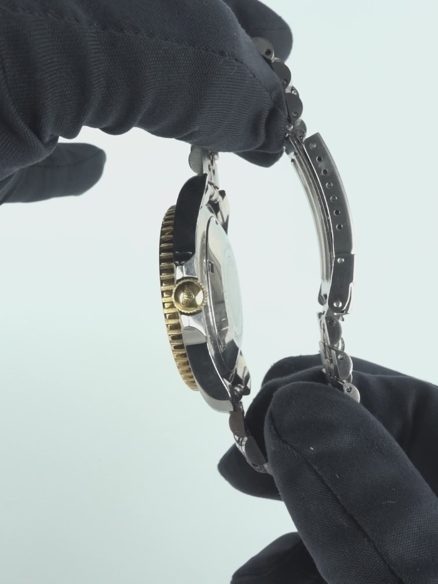 Its black dial is complemented by luminous markers and Mercedes hands, all framed by a unidirectional black bezel with a gold-tone edge. The gold crown adds to the refined contrast, giving the watch a striking yet classic appearance. A date window at 3 o’clock provides added practicality without disrupting the dial’s symmetry.