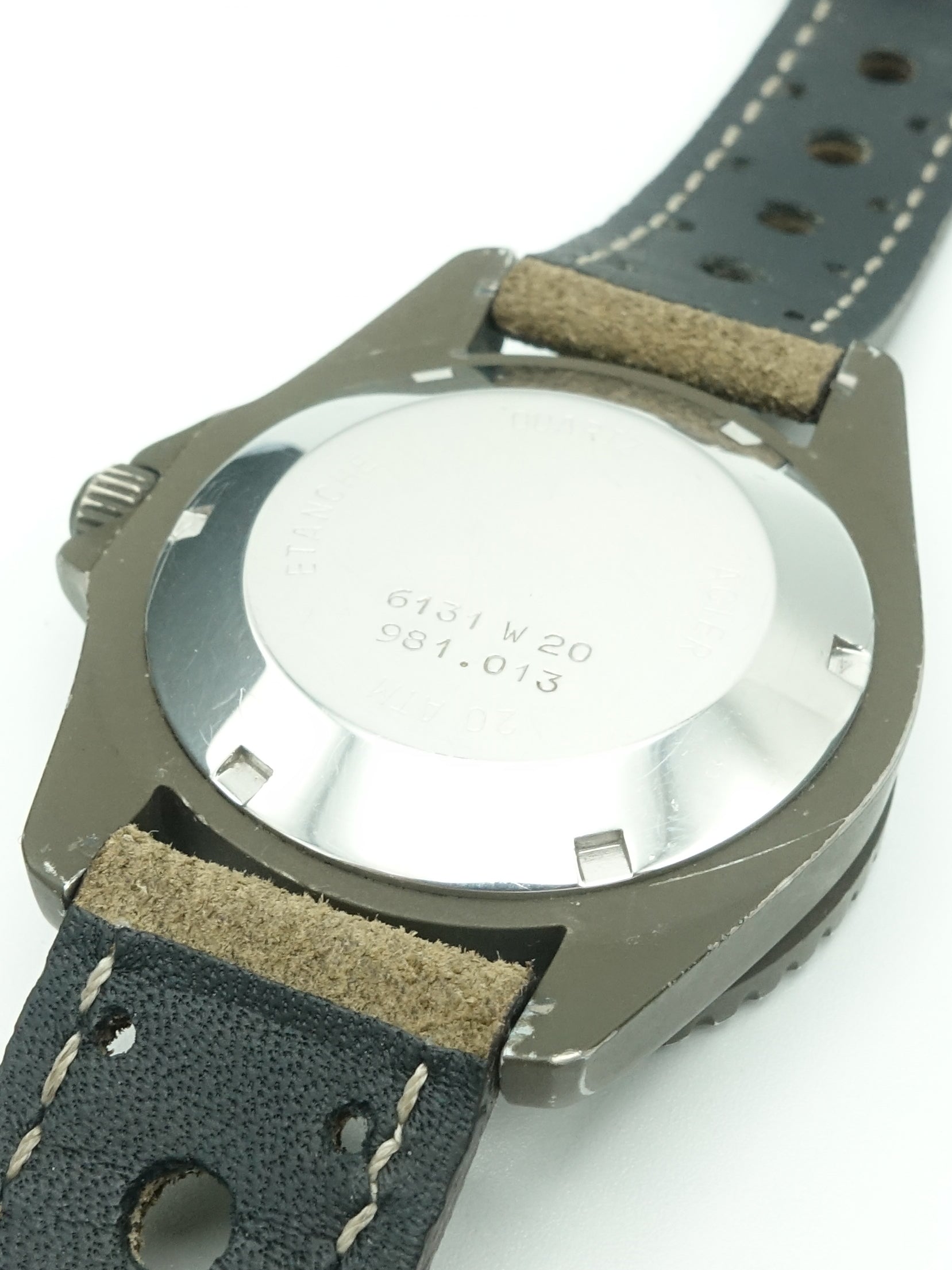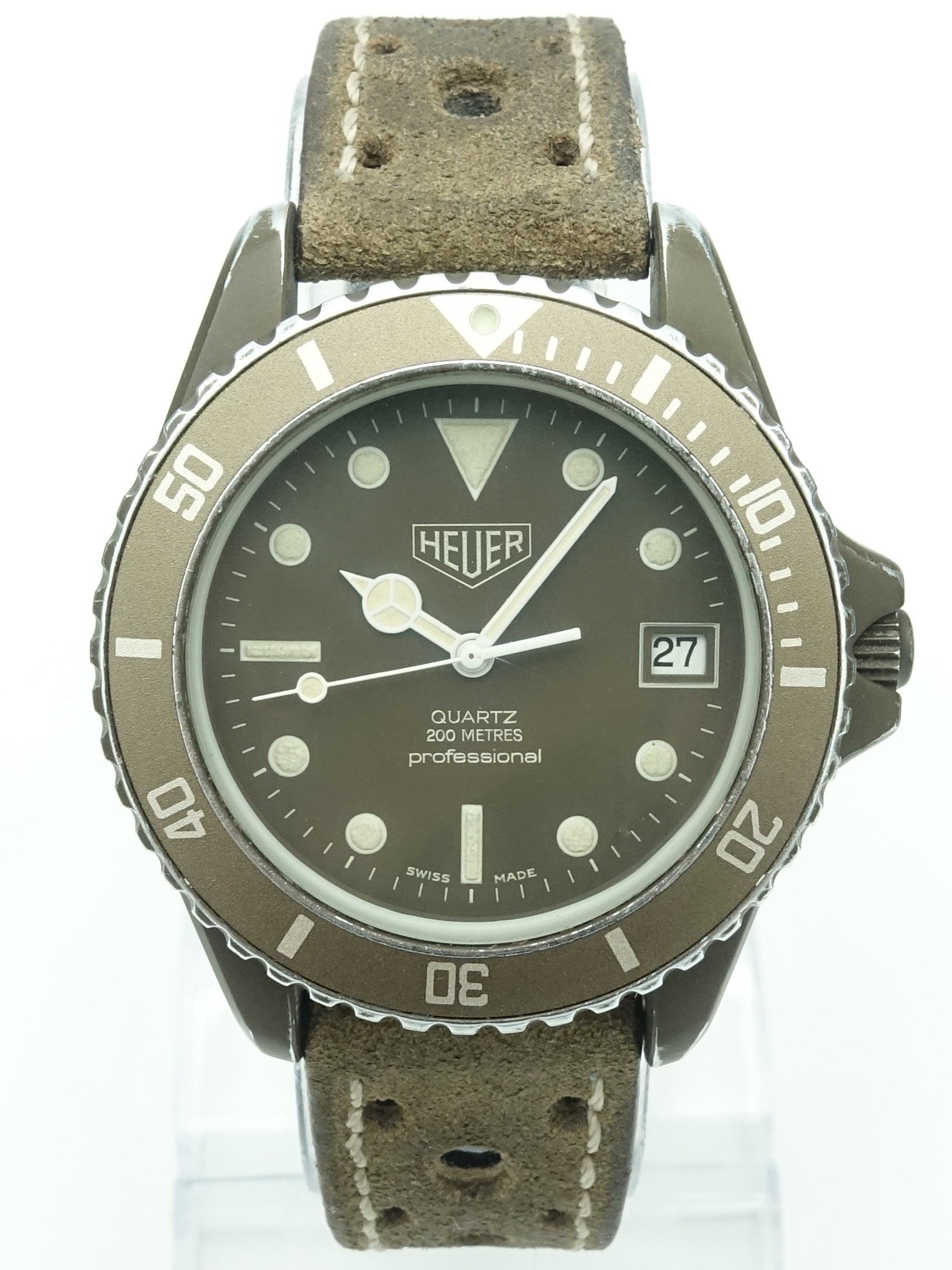 Considered the collection which saved Tag Heuer from bankruptcy during the quartz crisis, the 1000 series has an important part in horological history. This particular reference is the extremely rare olive PVD coated version. It's also the earliest model, before any letters were added to the reference, which means it has the thicker case and no '1000' under the logo. Speaking of the logo it's also 'Heuer' only, from a time before 'Tag' and 'Heuer' merged they are extremely rare to find and thus very collectable. It comes on a distressed style perforated leather strap which suits the watch perfectly. It is powered by an in-house movement and as with any Swiss quartz it’s extremely accurate and reliable.