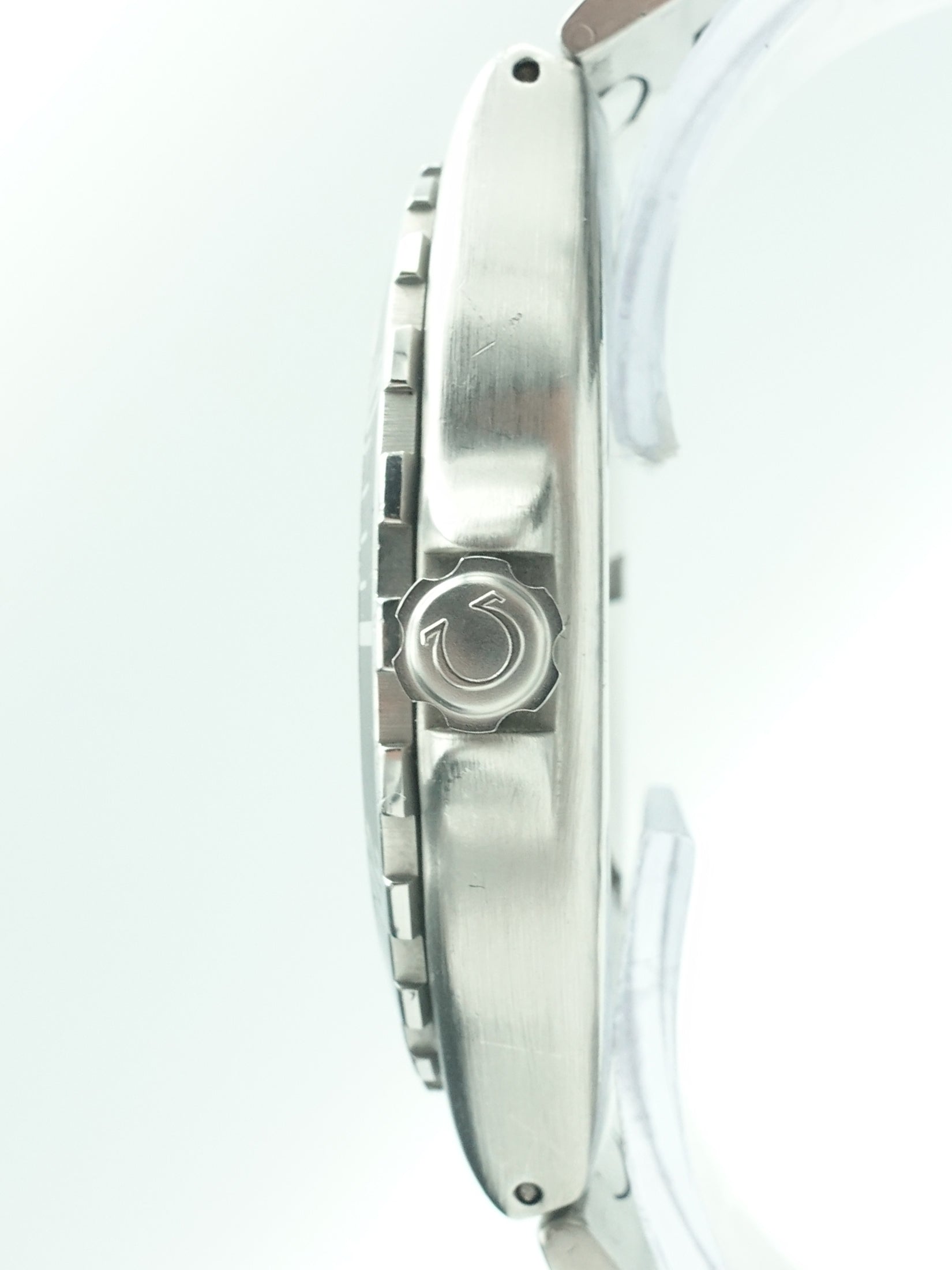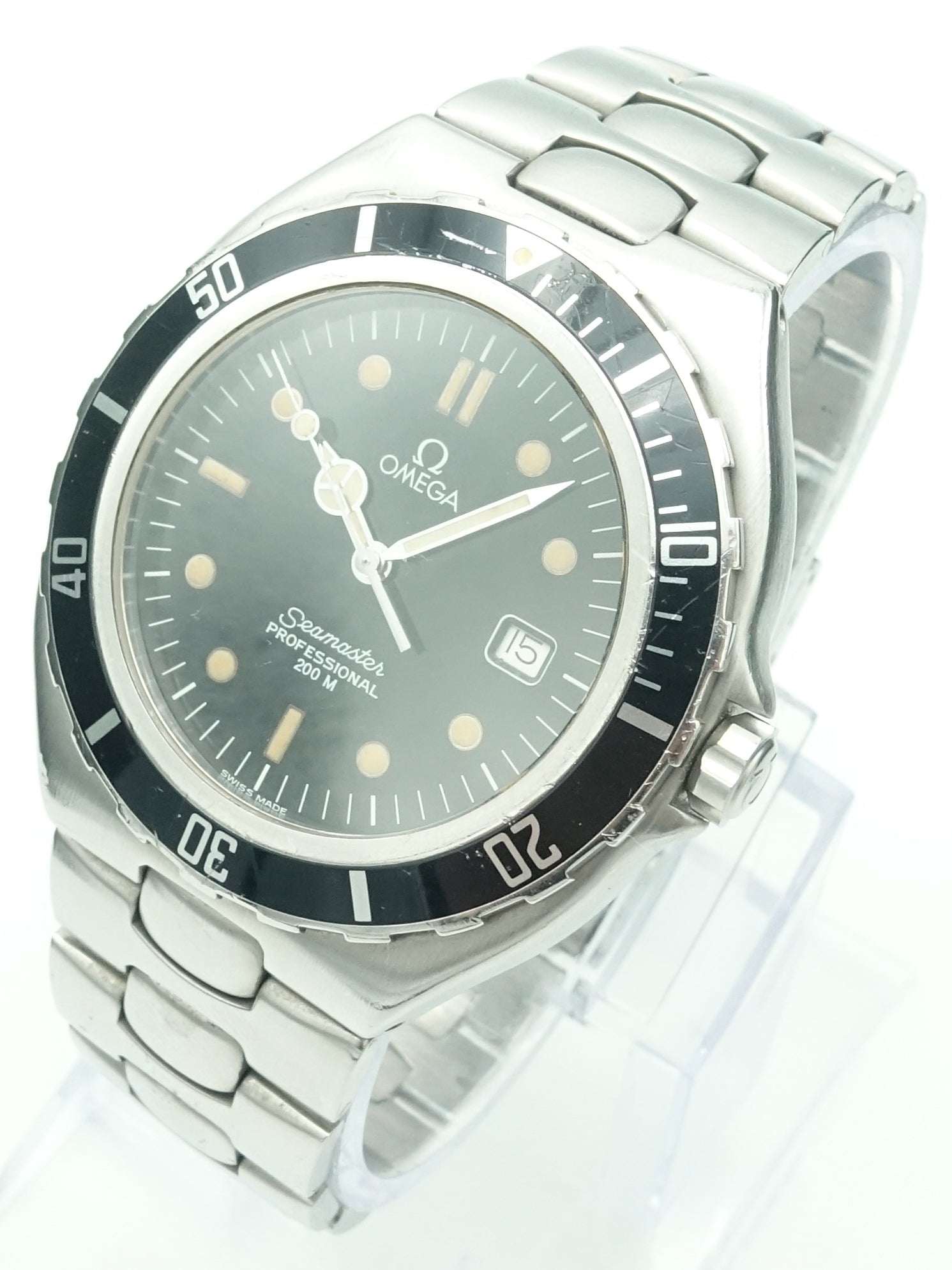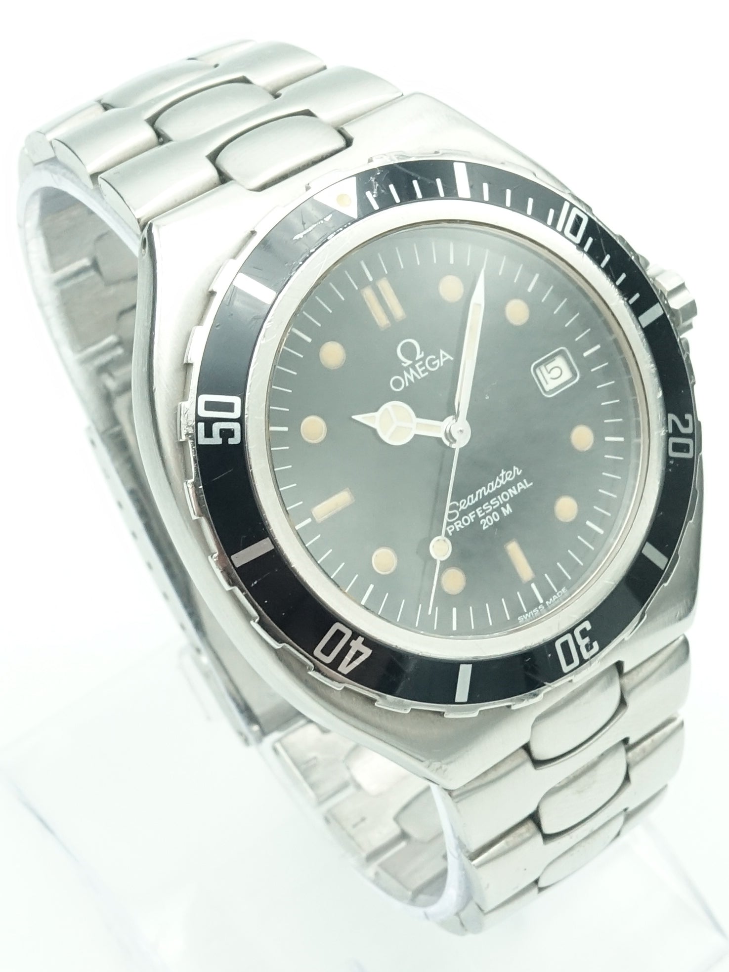 The watch features a 40mm stainless steel case with an integrated bracelet, embodying the design aesthetics that preceded the Seamaster models associated with the James Bond franchise. Its black dial is complemented by a unidirectional rotating bezel, underscoring its functionality as a professional dive watch.