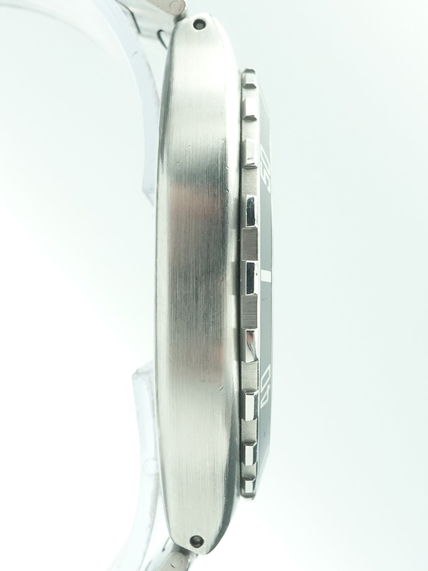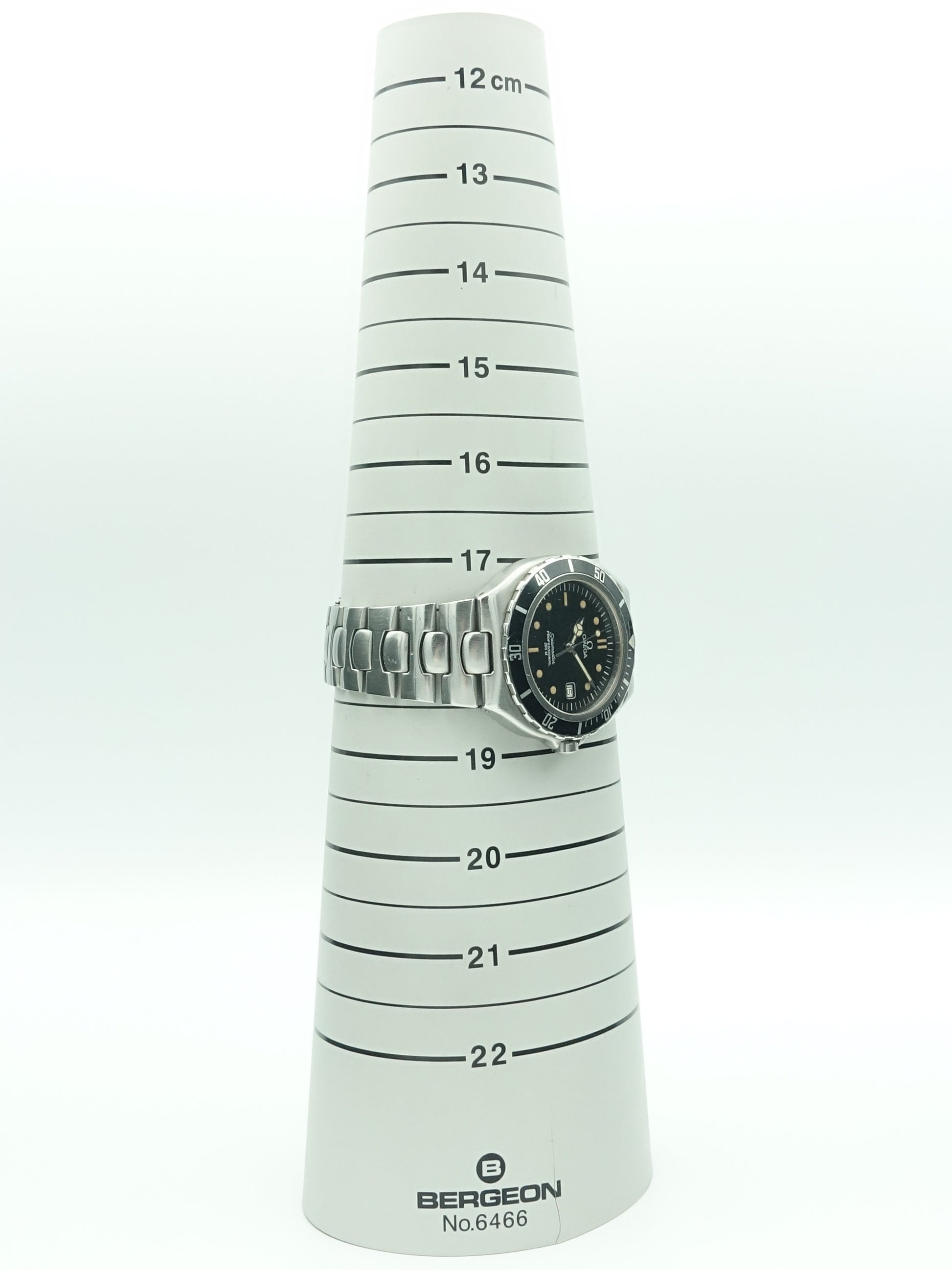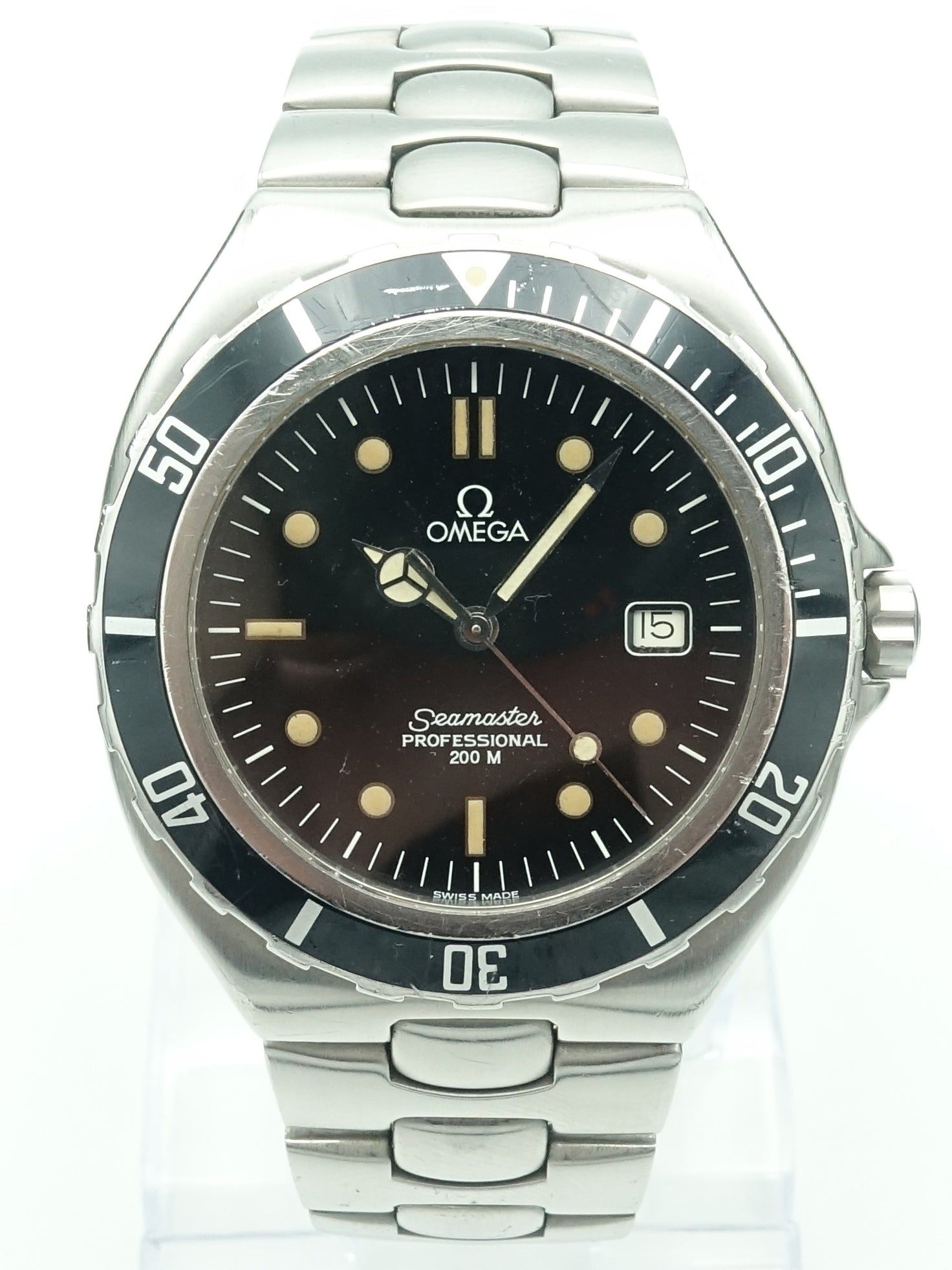 The watch features a 40mm stainless steel case with an integrated bracelet, embodying the design aesthetics that preceded the Seamaster models associated with the James Bond franchise. Its black dial is complemented by a unidirectional rotating bezel, underscoring its functionality as a professional dive watch.