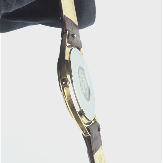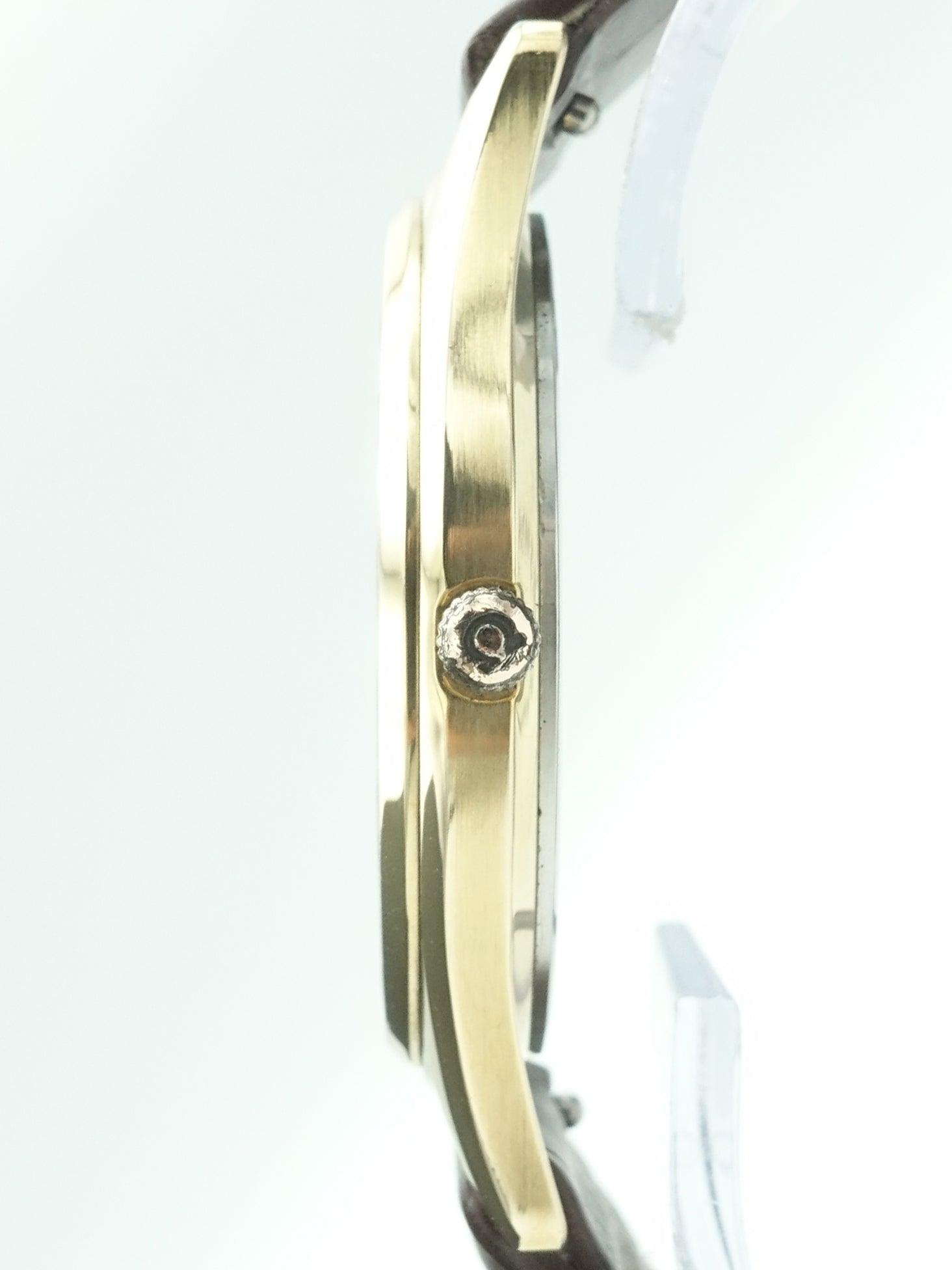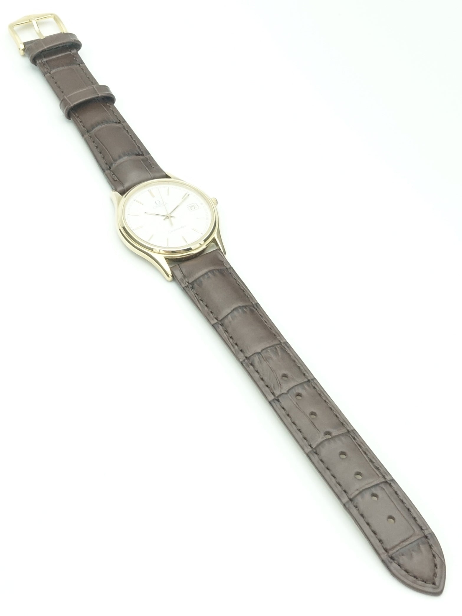 Powering this timepiece is Omega’s Caliber 1430, a quartz electronic analog movement renowned for its accuracy and reliability. The watch is paired with a high-quality leather strap, offering a comfortable fit and a classic look that complements the gold case.