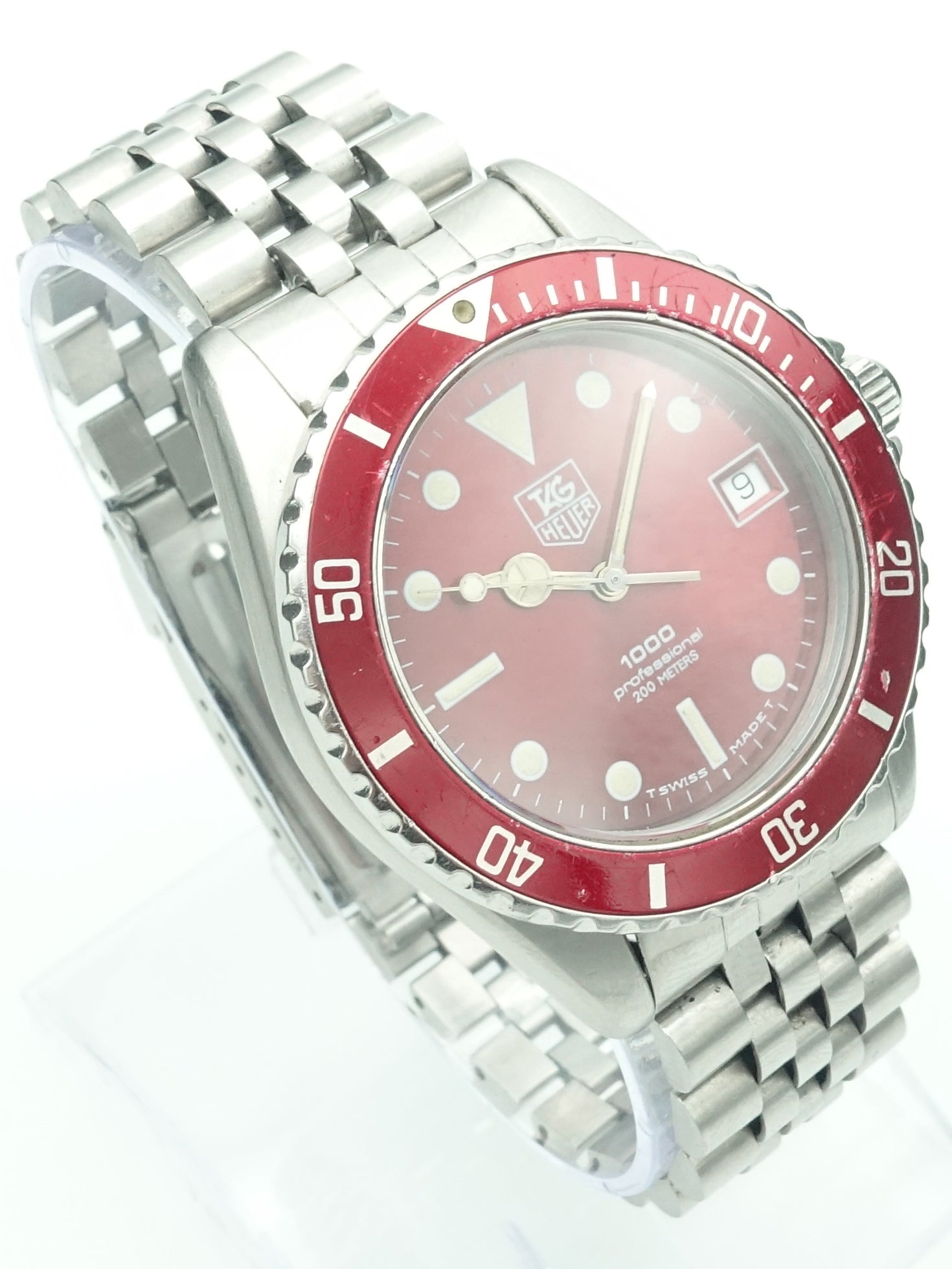 Introducing the 1995 TAG Heuer 1000 Ref. 980.913N. A distinguished timepiece celebrated for its rare red sunburst dial. This vibrant dial, complemented by a matching red bezel, was produced for a limited period, making it highly sought after among collectors.
