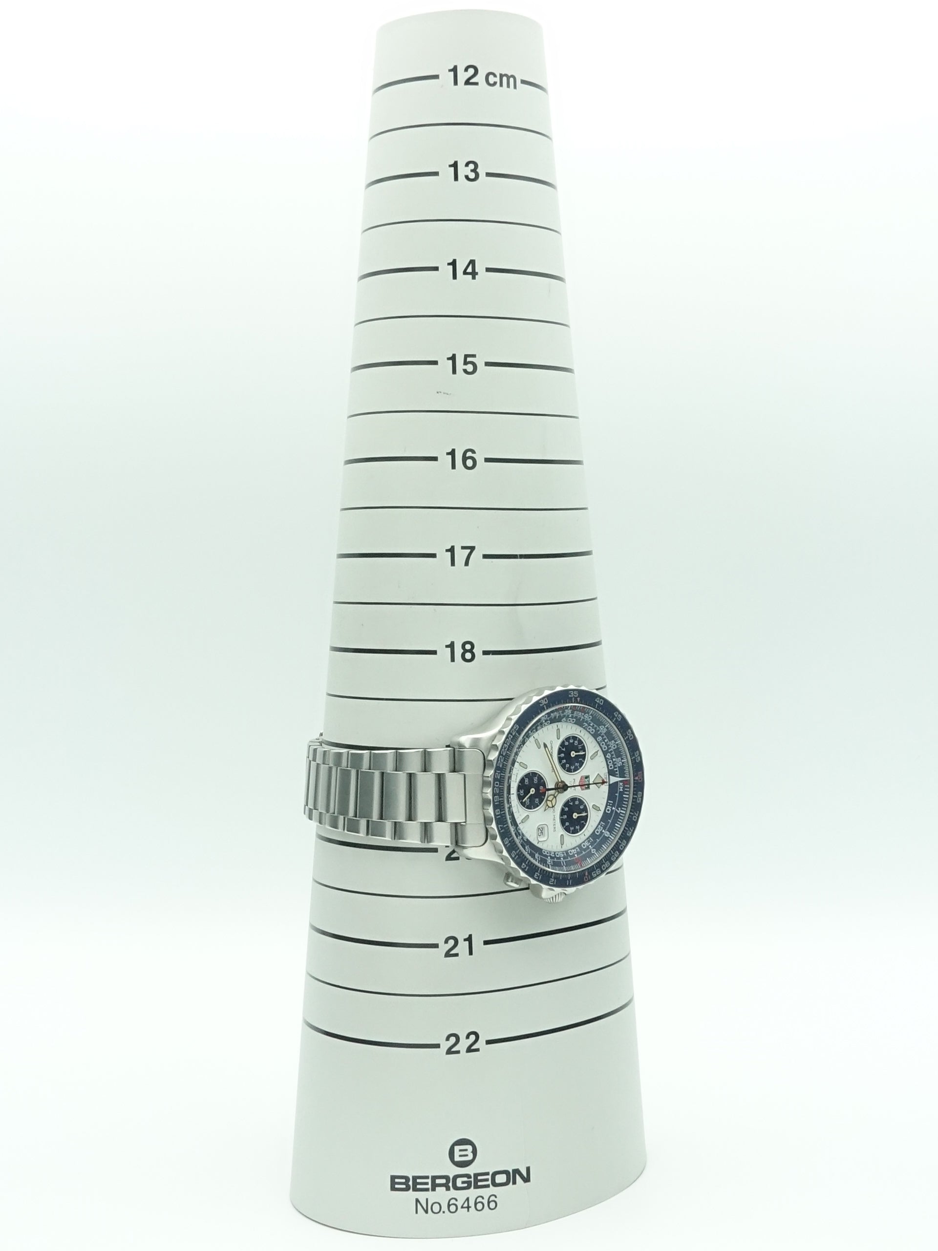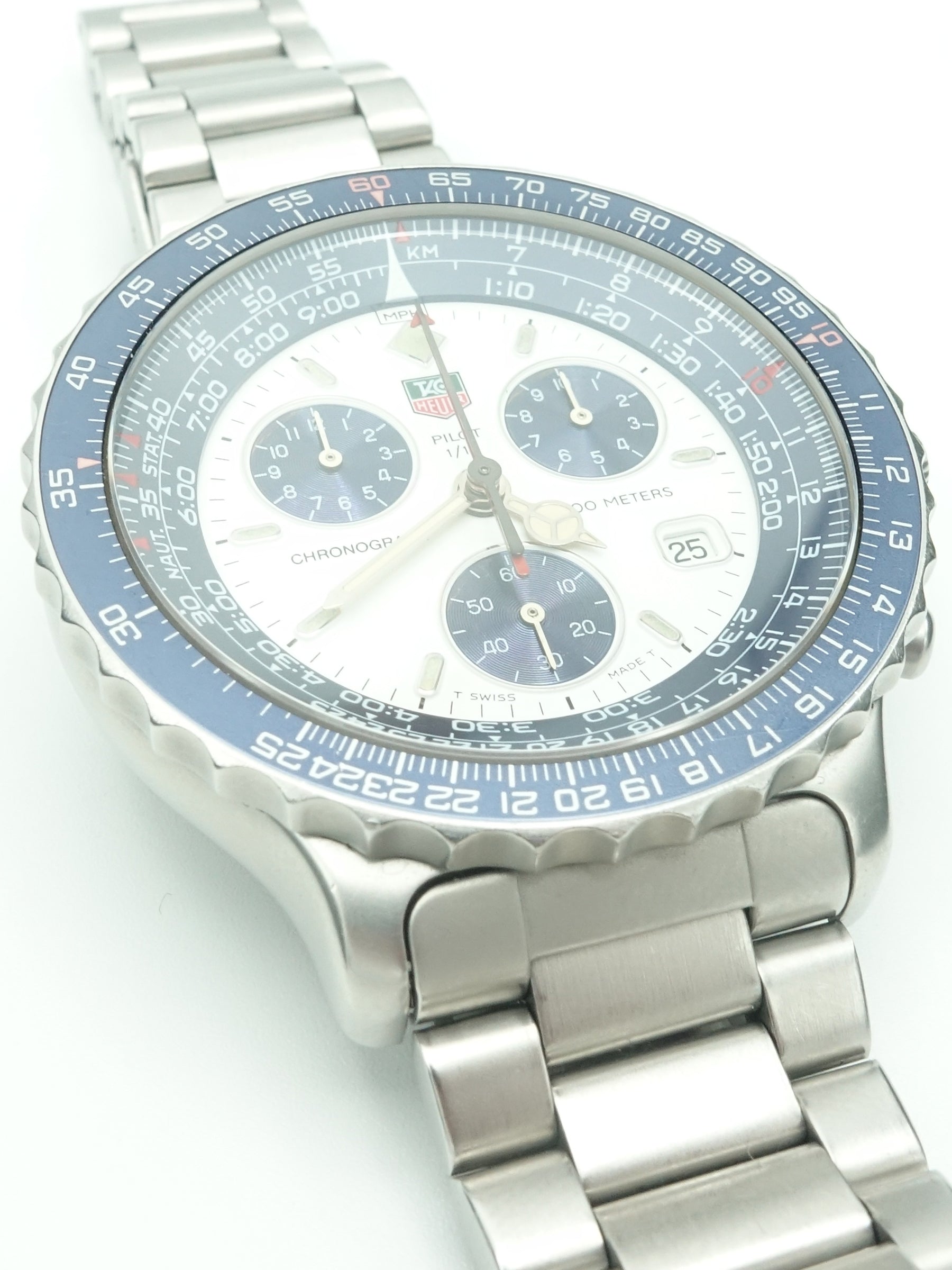 The 1995 TAG Heuer 2000 Pilot Ref. 530.806K is a distinctive chronograph that embodies the brand’s commitment to precision and functionality. This model features a 42mm stainless steel case, offering a robust presence on the wrist. The white dial is complemented by a blue inner bezel, providing a striking contrast and enhancing legibility. Equipped with a quartz movement, the watch ensures accurate timekeeping and includes chronograph functions for measuring elapsed time. The timepiece is fitted with a stainless steel bracelet, completing its sporty yet sophisticated aesthetic.