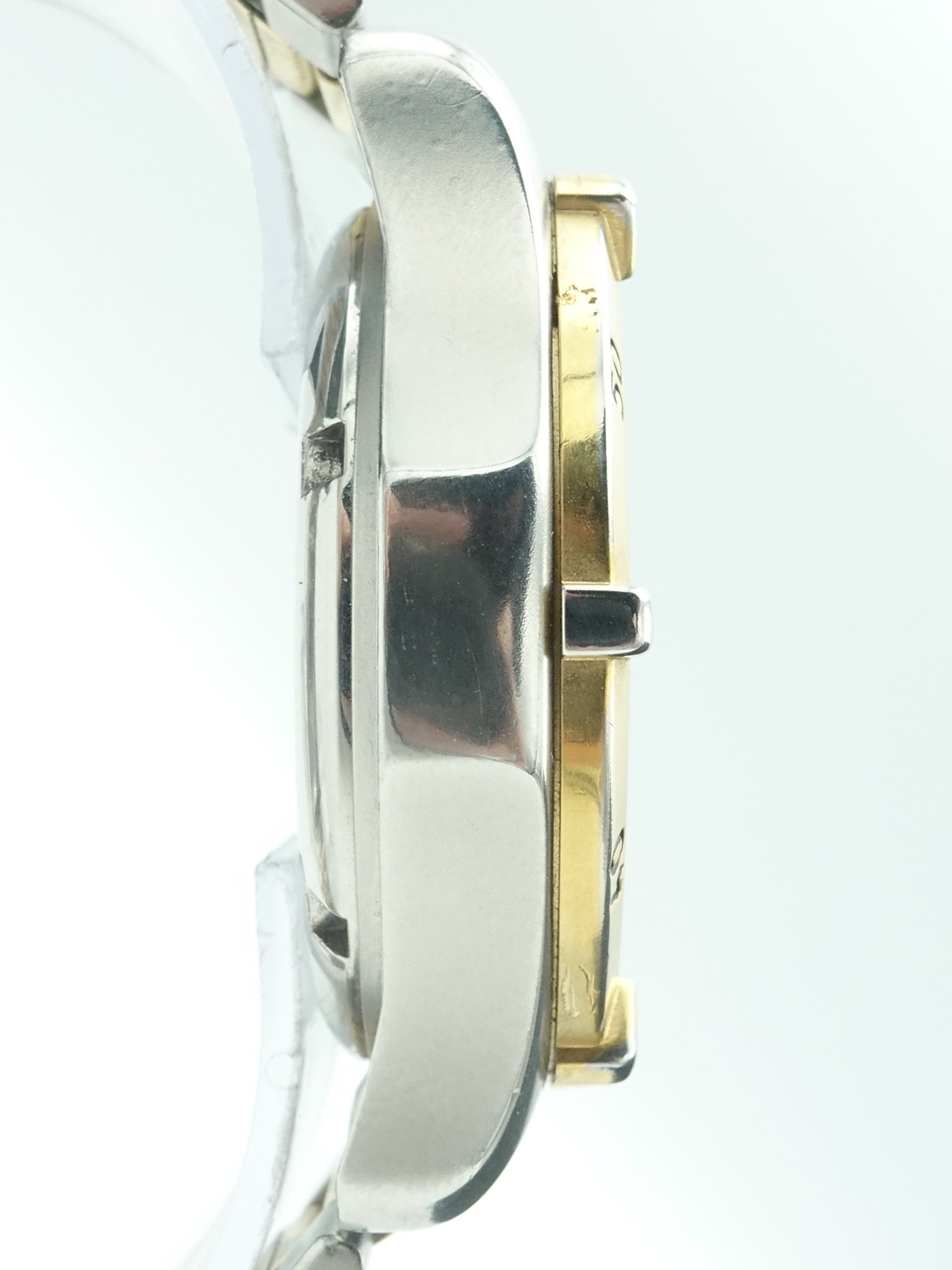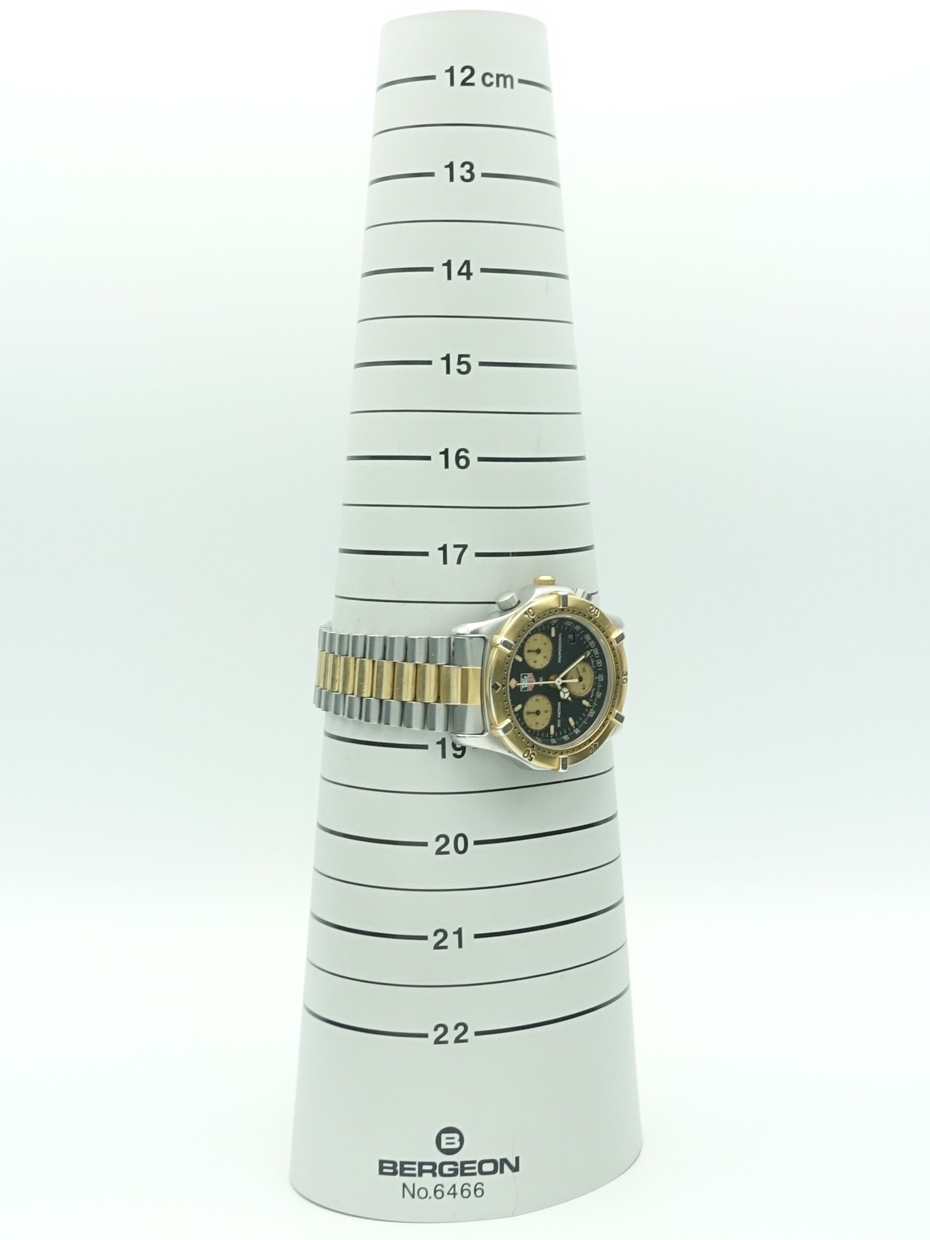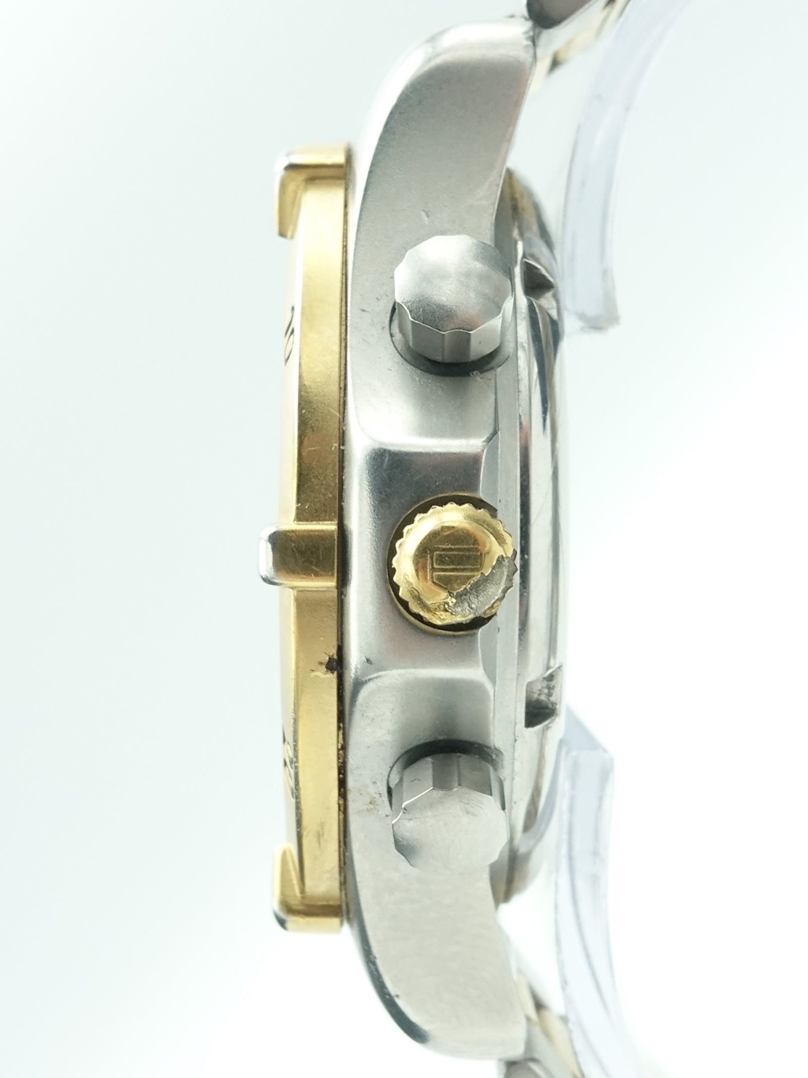 Introducing the 1995 TAG Heuer 2000 Series Ref. 565.306R. A distinguished timepiece that combines durability with refined aesthetics. This model features a 38mm two-tone stainless steel and gold case, complemented by a unidirectional rotating bezel, emphasizing its robust design. The black dial, adorned with gold-tone hour markers and hands, ensures excellent readability, while the date display at the 3-4 o’clock position adds practicality.
