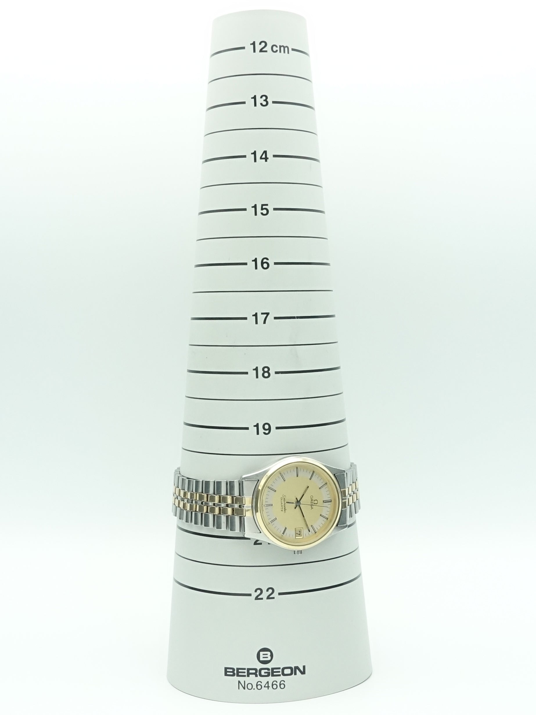A dressier reference from Omega's flagship ‘Seamaster’ collection. This example has a stunning two tone gold/silver colour way with a beautiful 'pie pan' style dial that needs to be seen in person to be truly appreciated. It's fitted on its original ‘jubilee’ style bracelet which suits the watch well. At only 5mm thick, it's perfect to slip under a shirt cuff for a classy look. The calibre 1337 movement features a date complication and as with any Swiss quartz movement it’s extremely accurate and reliable.