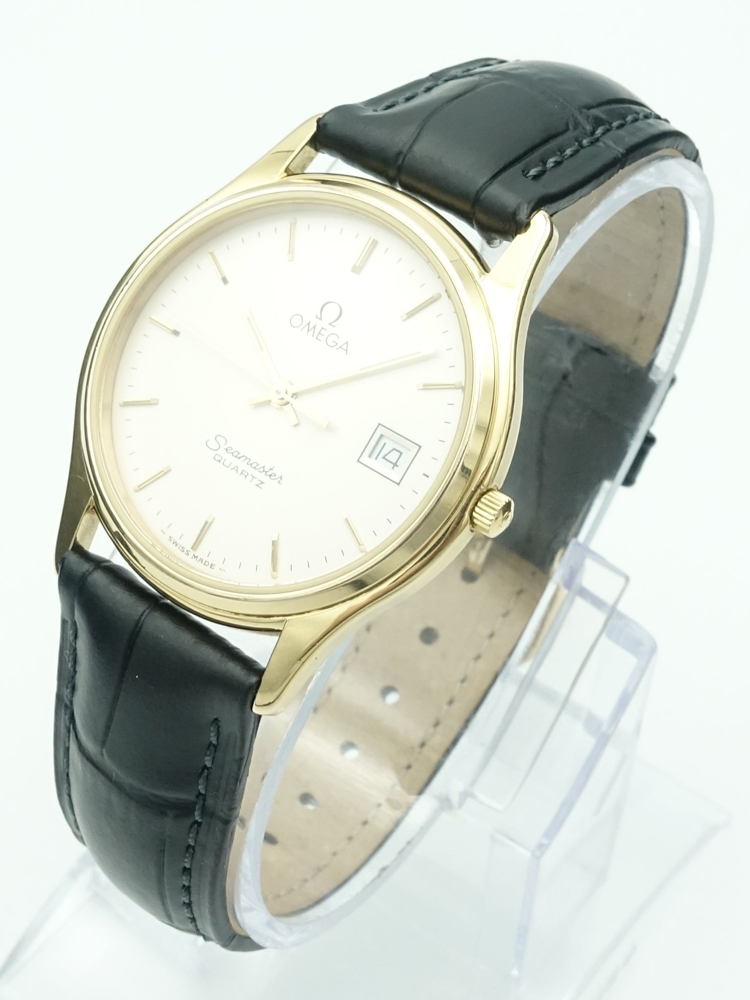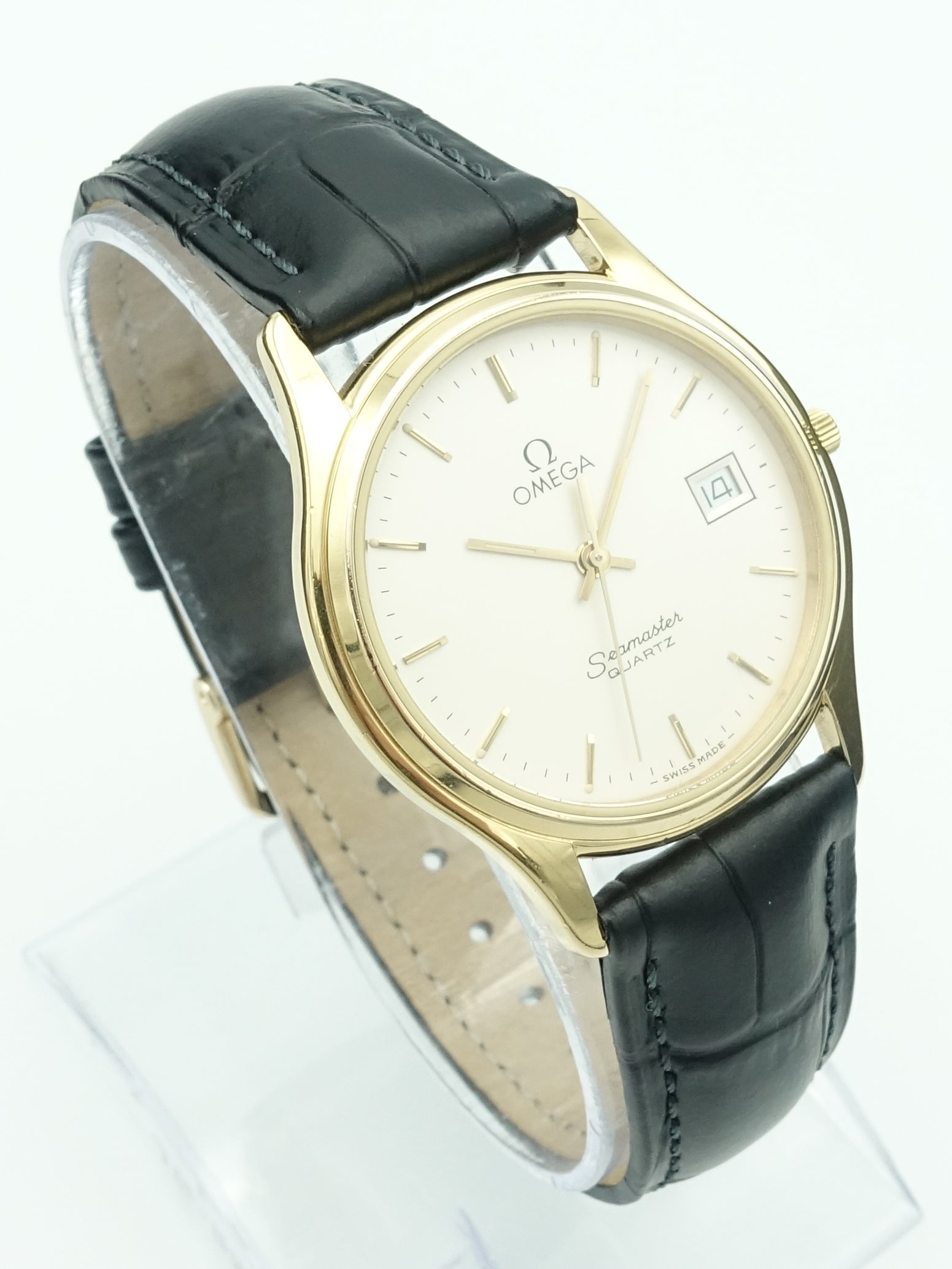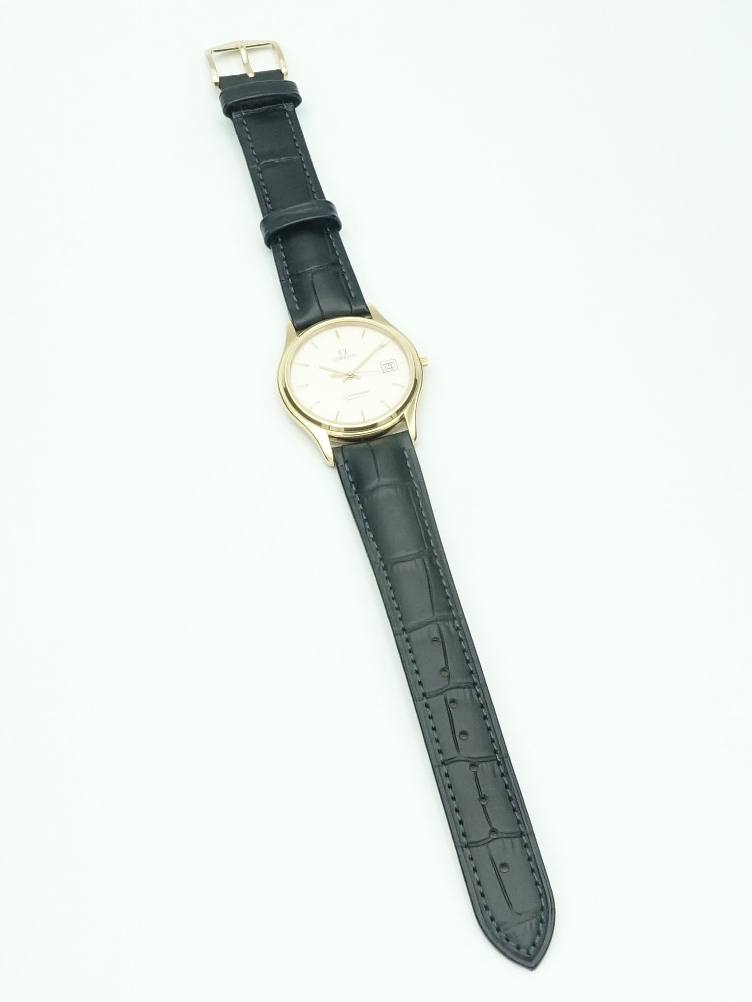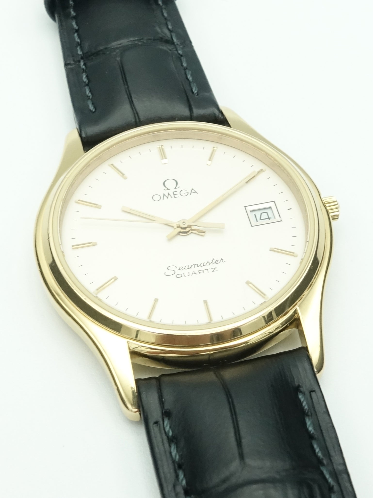 A dressier reference from Omega's flagship ‘Seamaster’ collection. This example has a stunning golden case with a white dial which looks classy on the wrist. The calibre 1430 movement features a date complication and as with any Swiss quartz movement it’s extremely accurate and reliable. It's fitted on a brand new Hirsch leather strap which suits the watch well.