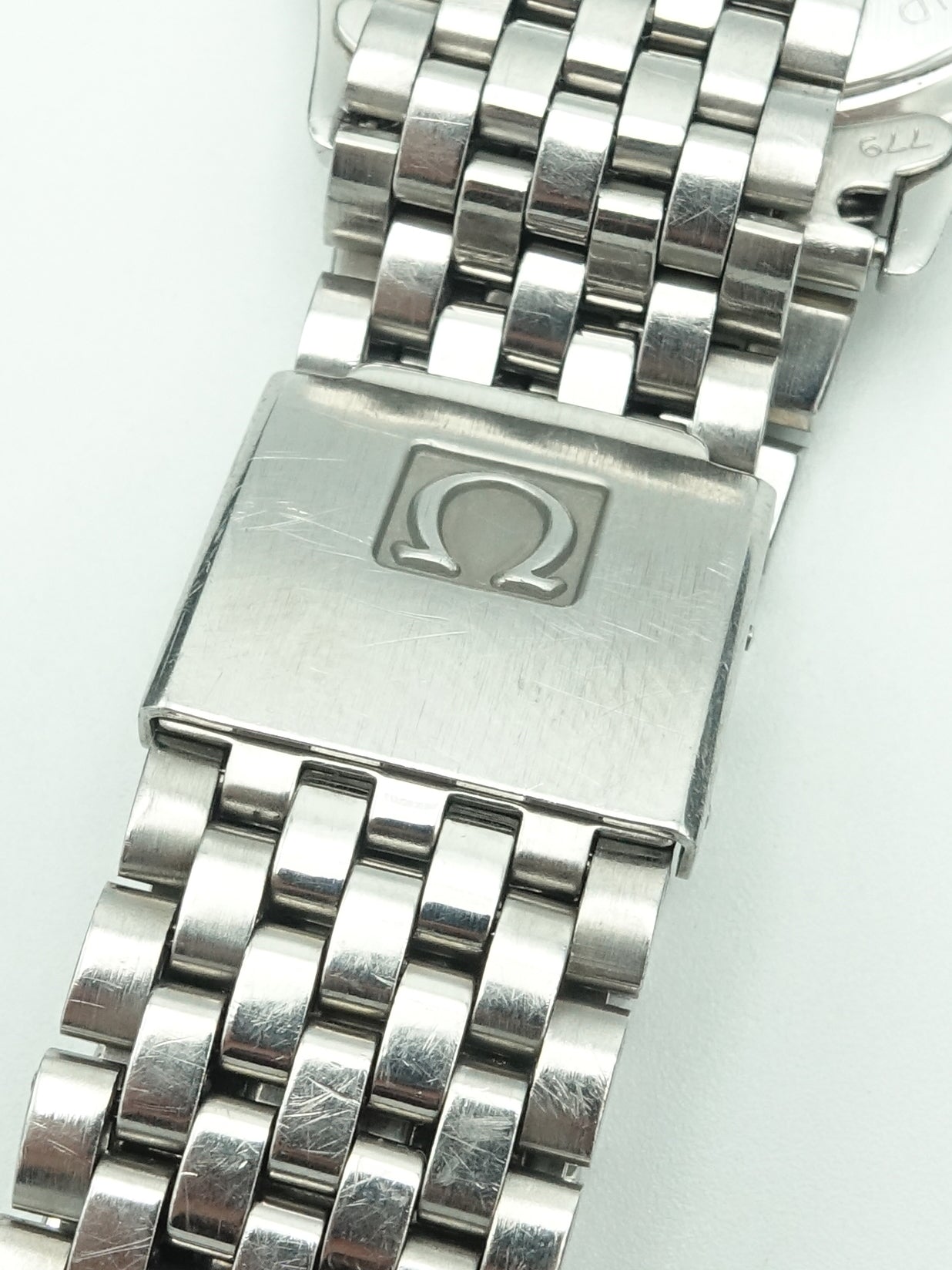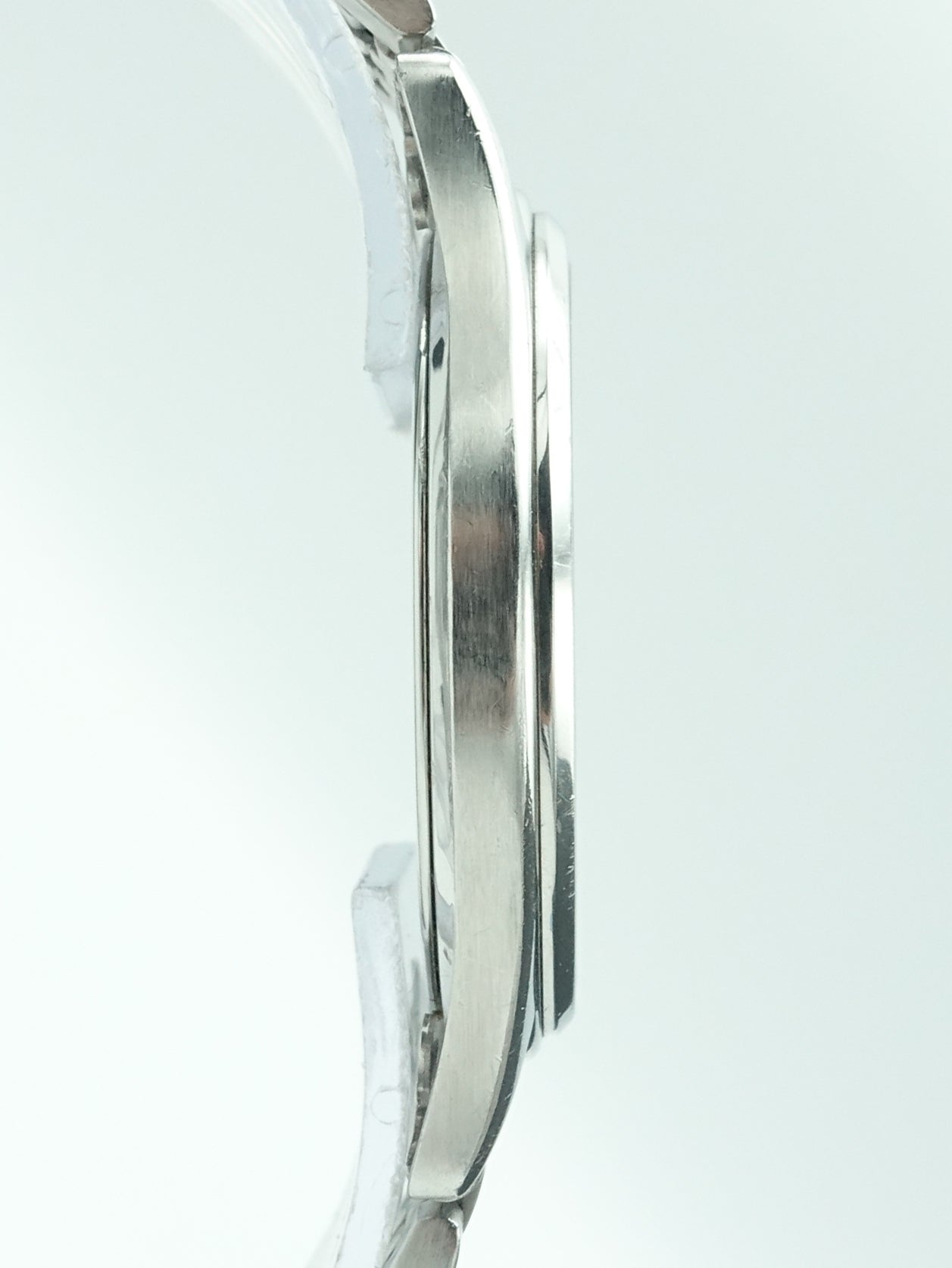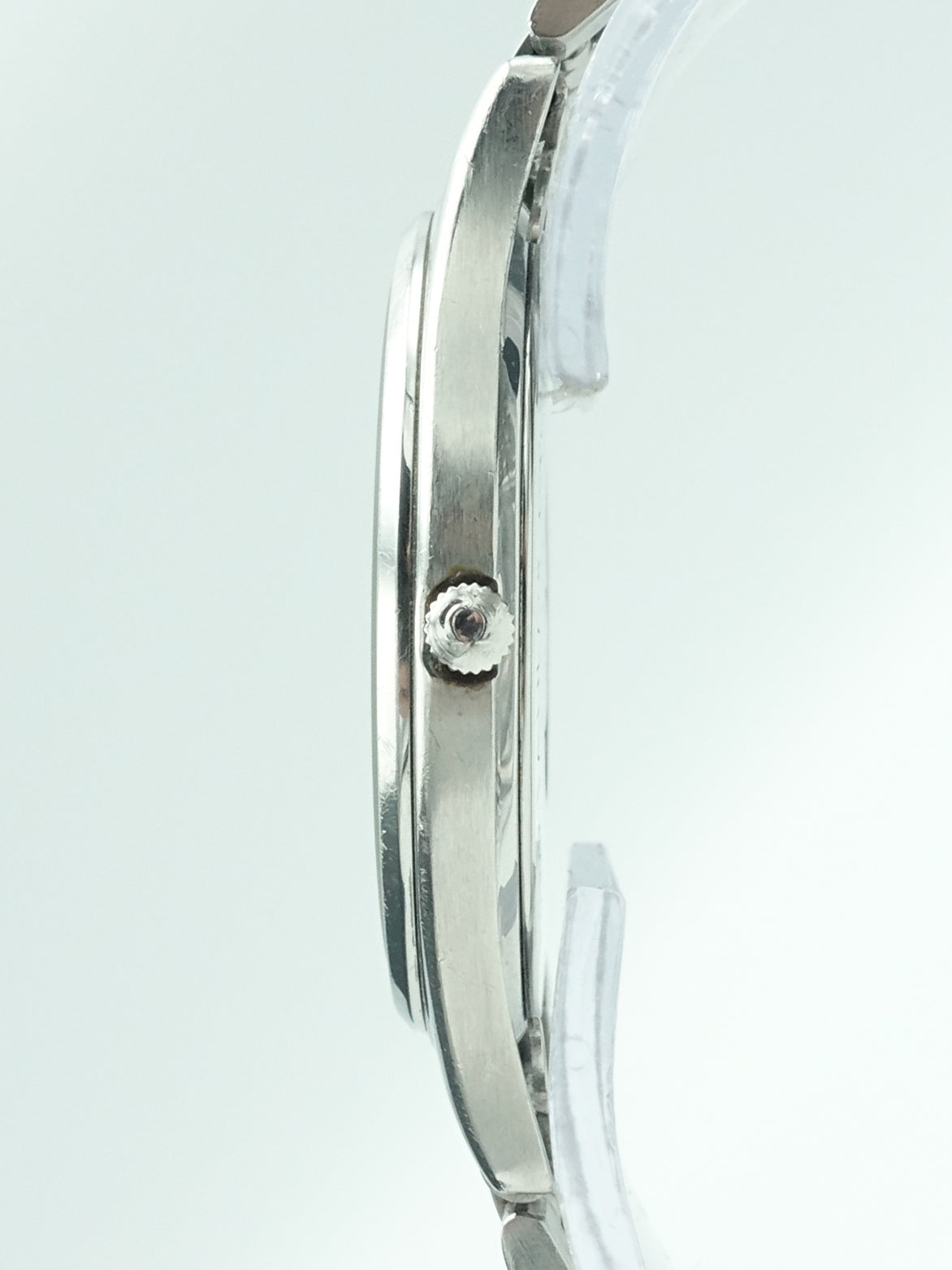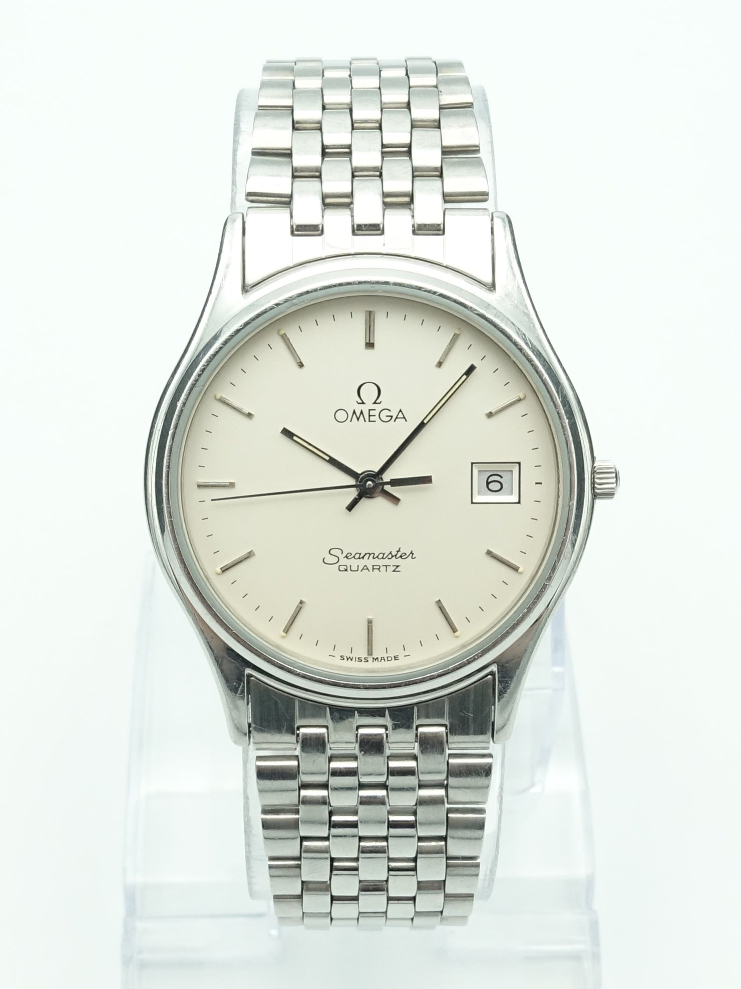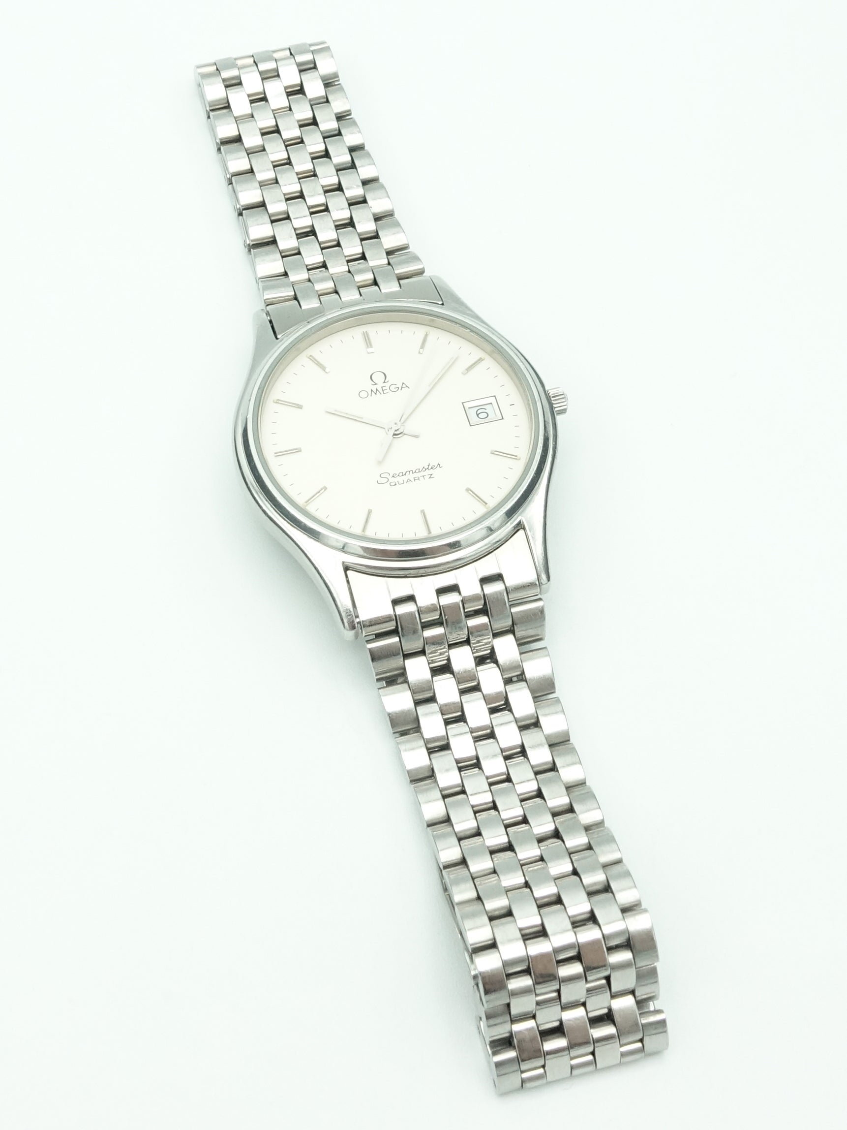 A dressier reference from Omega's flagship ‘Seamaster’ collection. This example has a stunning silver colour way with a beautiful white dial that needs to be seen in person to be truly appreciated. It also has its original Omega ‘beads of rice’ style bracelet which is iconic of its era. At only 5mm thick, it's perfect to slip under a shirt cuff for a classy look. The calibre 1430 movement features a date complication and as with any Swiss quartz movement it’s extremely accurate and reliable.