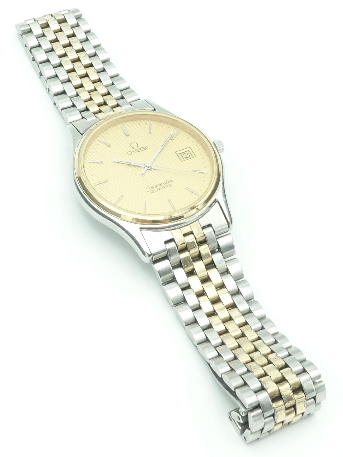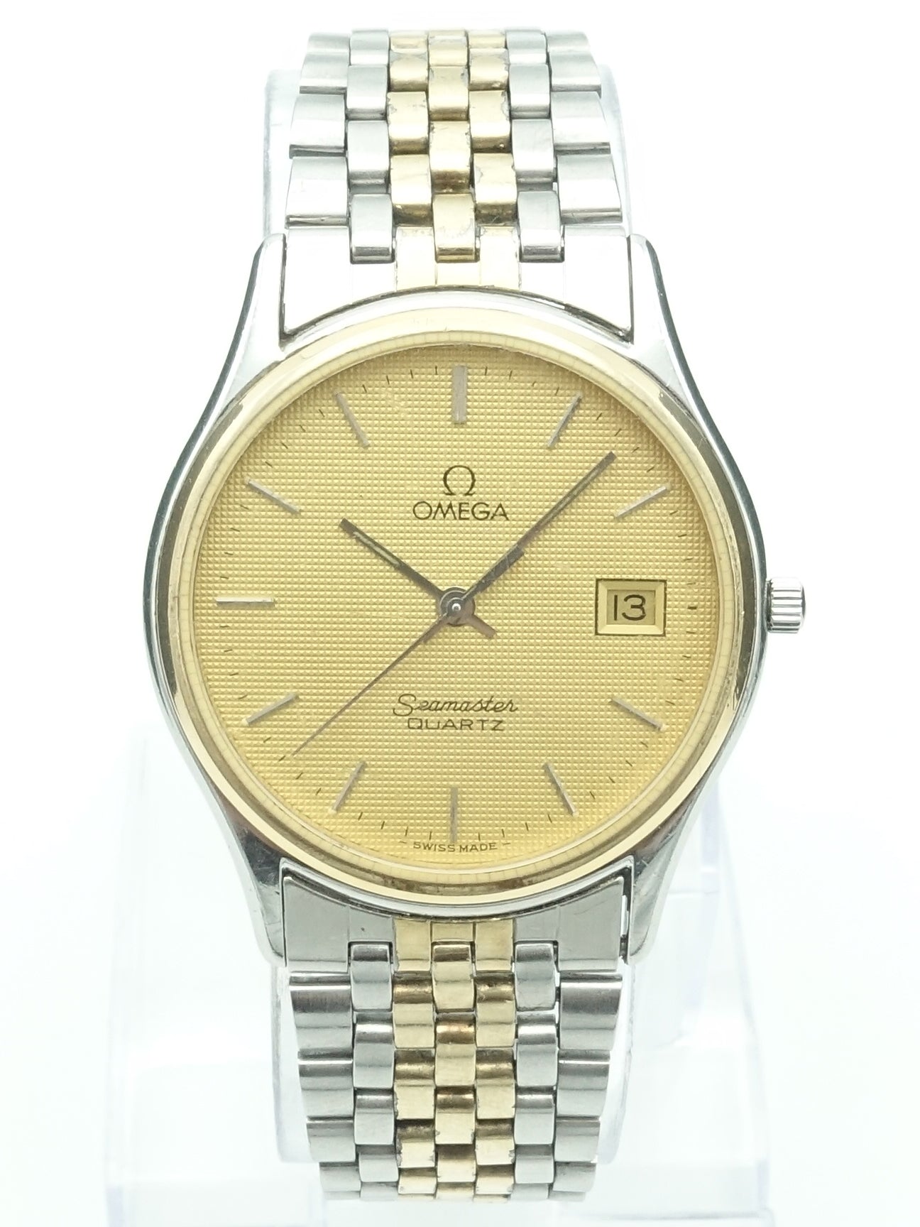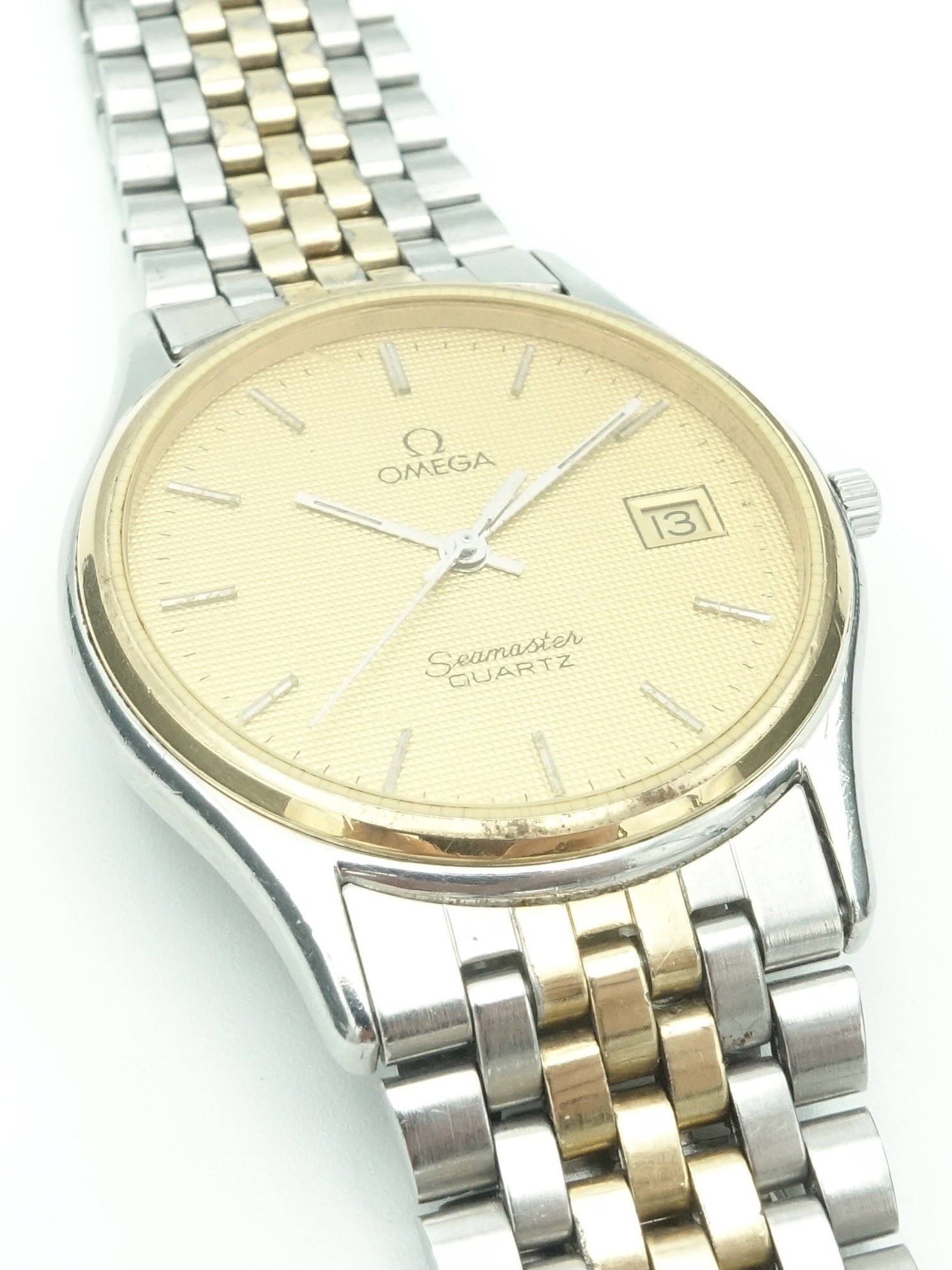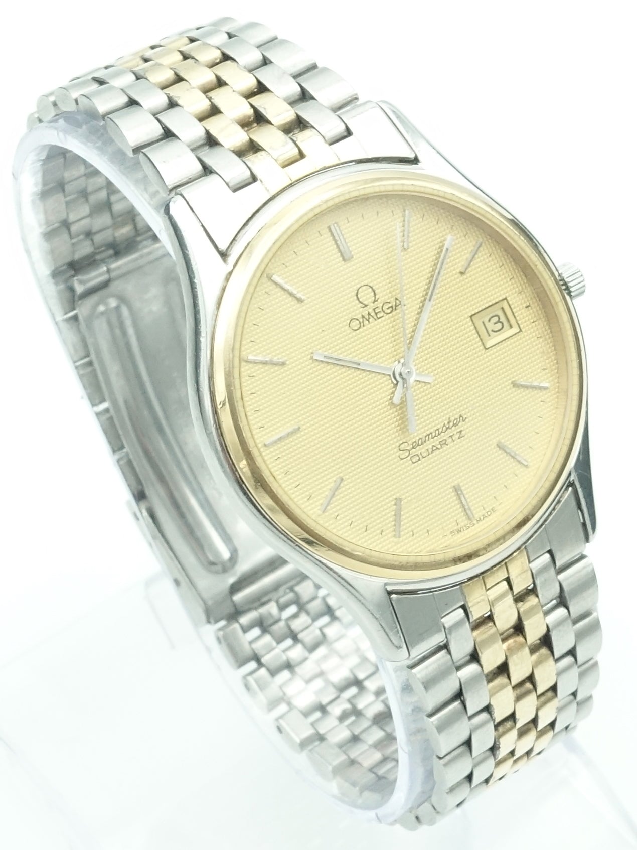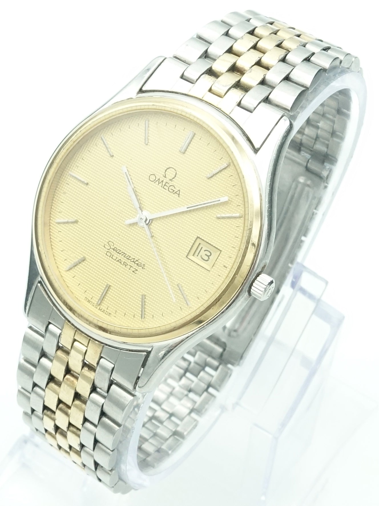 A dressier reference from Omega's flagship ‘Seamaster’ collection. This example has a stunning gold and silver colour way with a beautiful textured dial that needs to be seen in person to be truly appreciated. It also has its original Omega ‘jubilee’ style bracelet which is iconic of its era. At only 5mm thick, it's perfect to slip under a shirt cuff for a classy look. The calibre 1430 movement features a date complication and as with any Swiss quartz movement it’s extremely accurate and reliable.