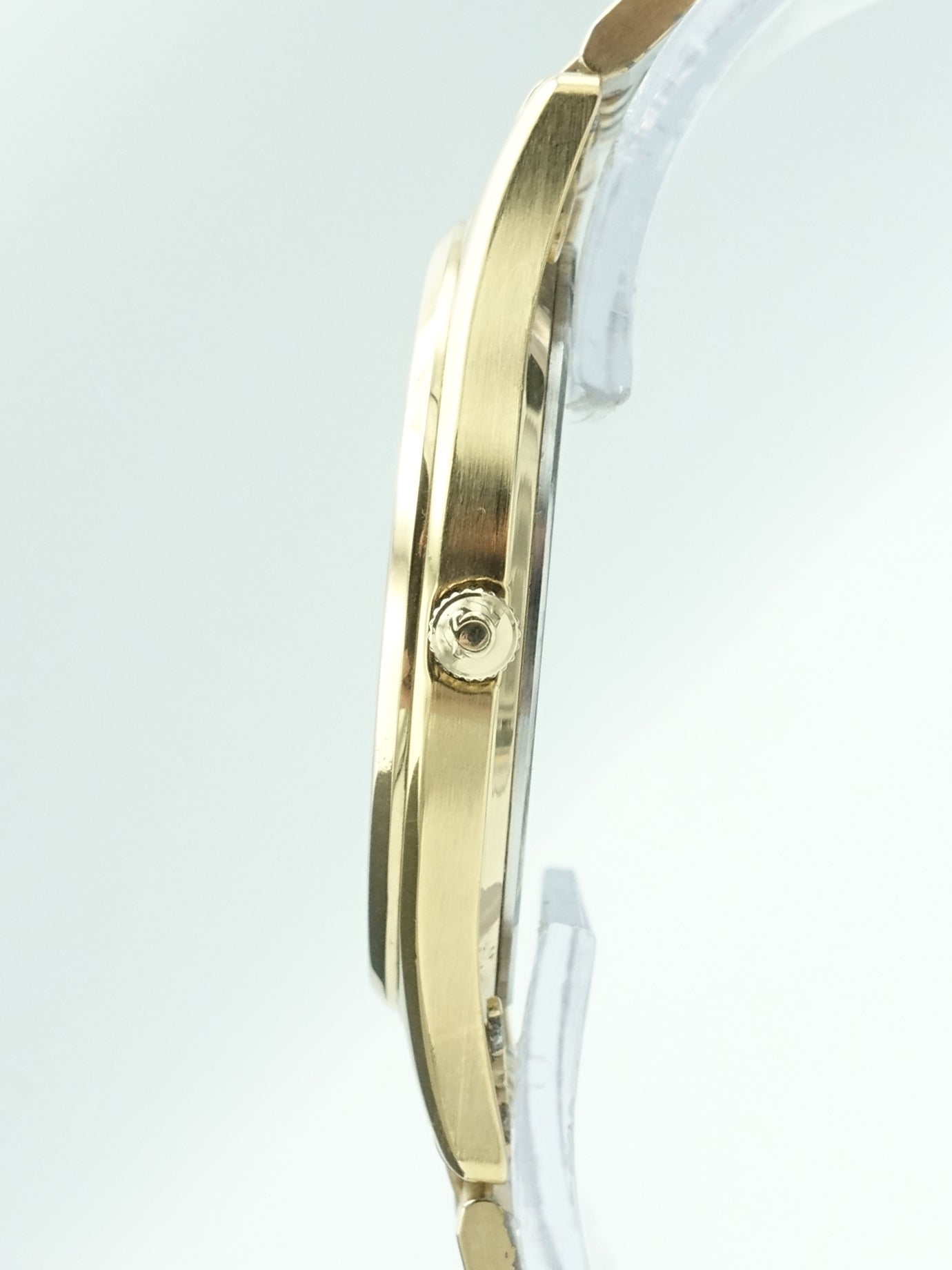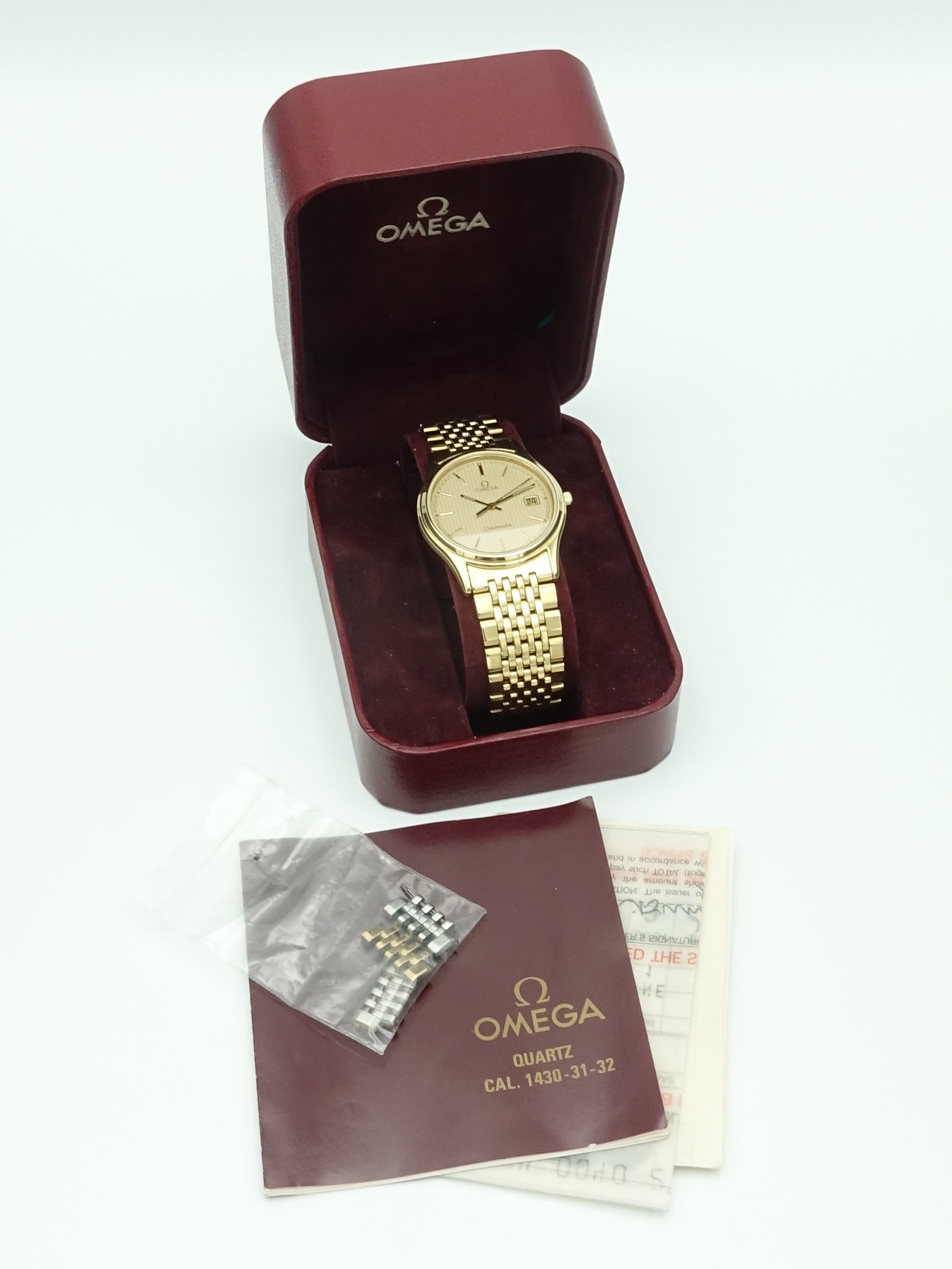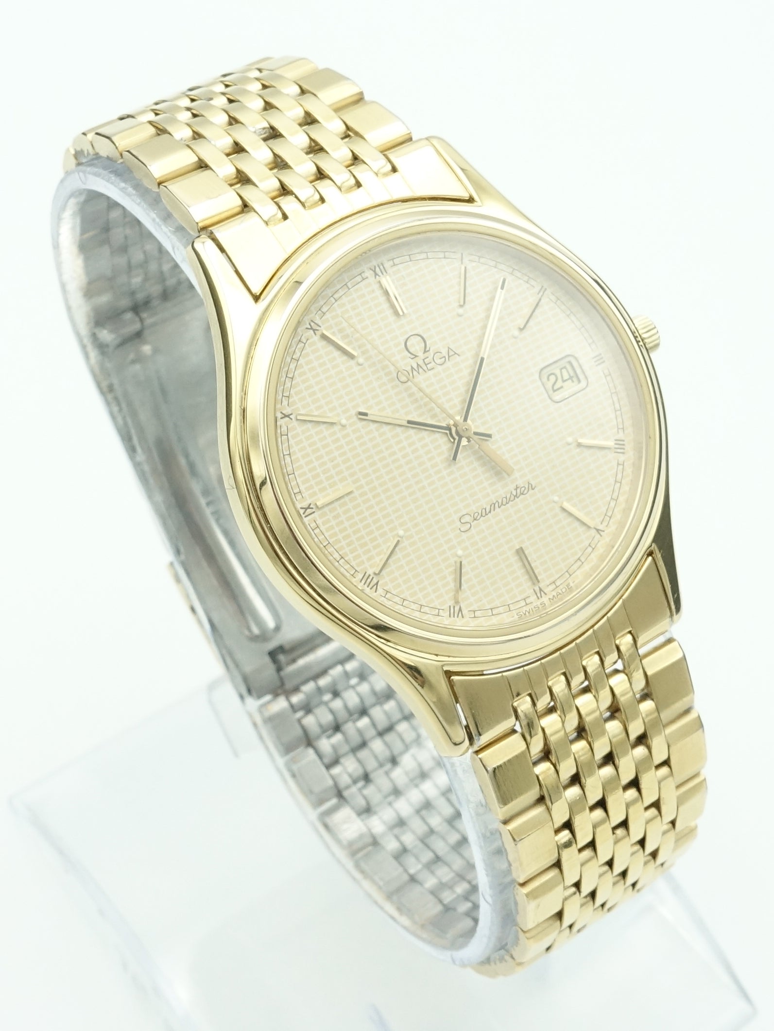 A dressier reference from Omega's flagship ‘Seamaster’ collection. This example has a stunning all gold colorway with a beautiful textured dial that needs to be seen in person to be truly appreciated. It also has its original Omega ‘beads of rice’ style bracelet which is iconic of its era. The calibre 1430 movement features a date complication and as with any Swiss quartz movement it’s extremely accurate and reliable.