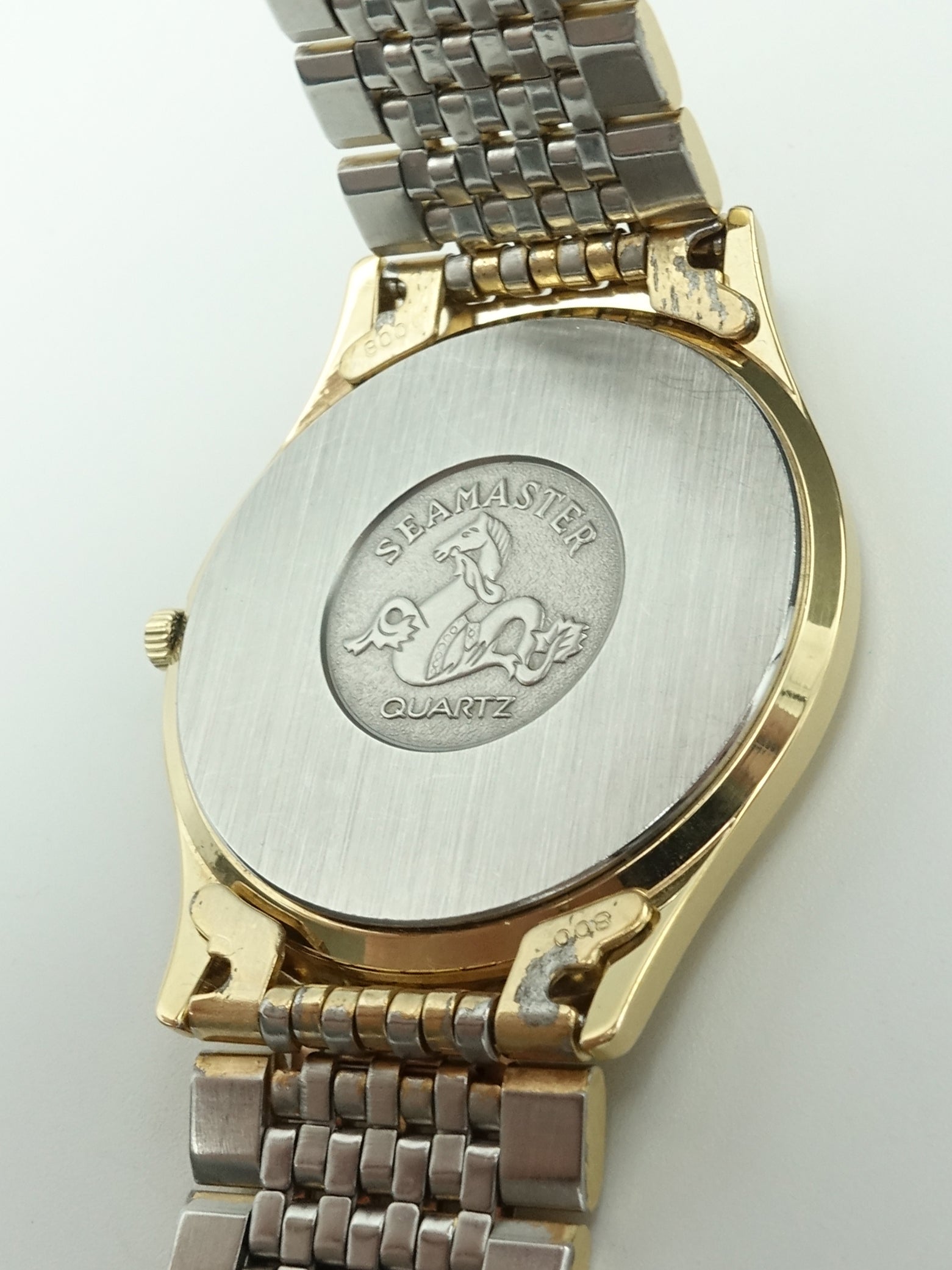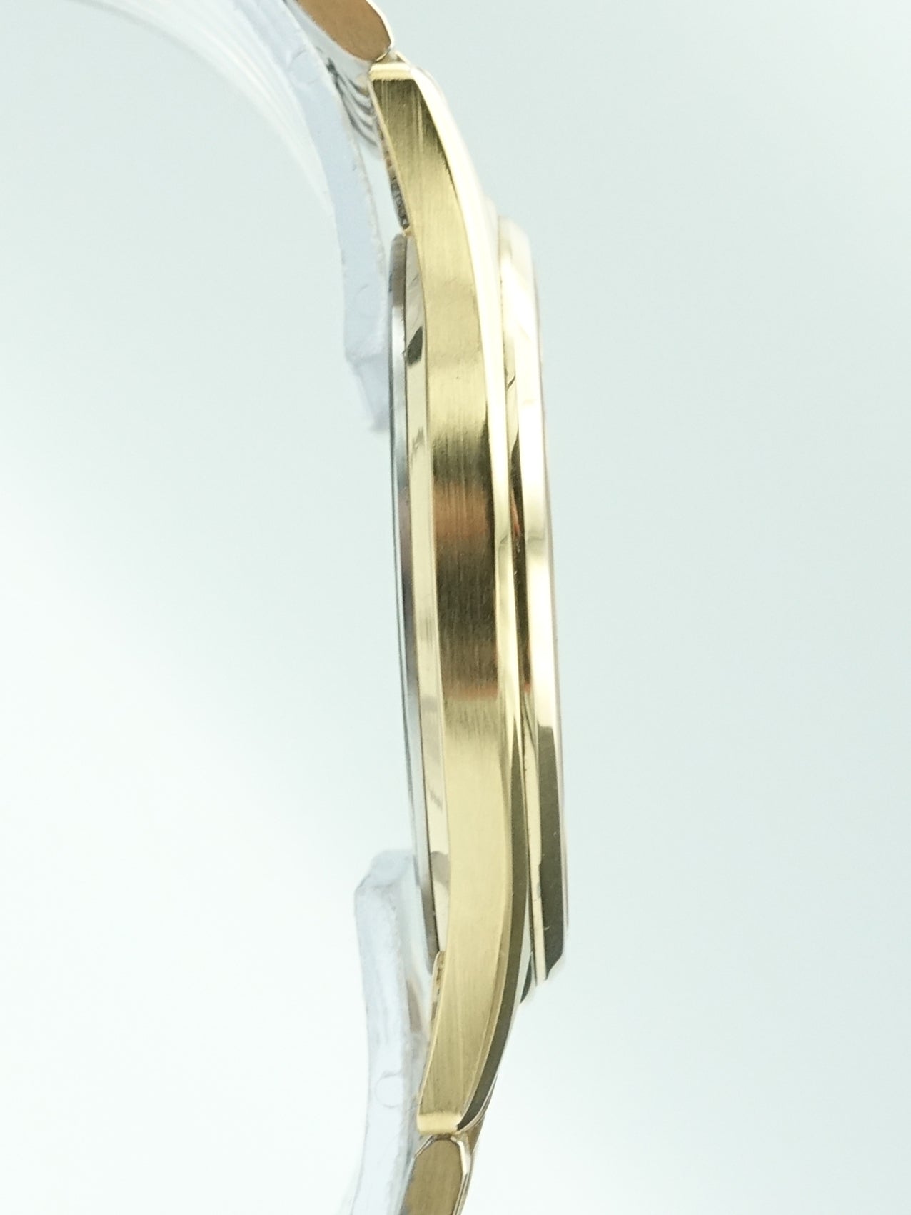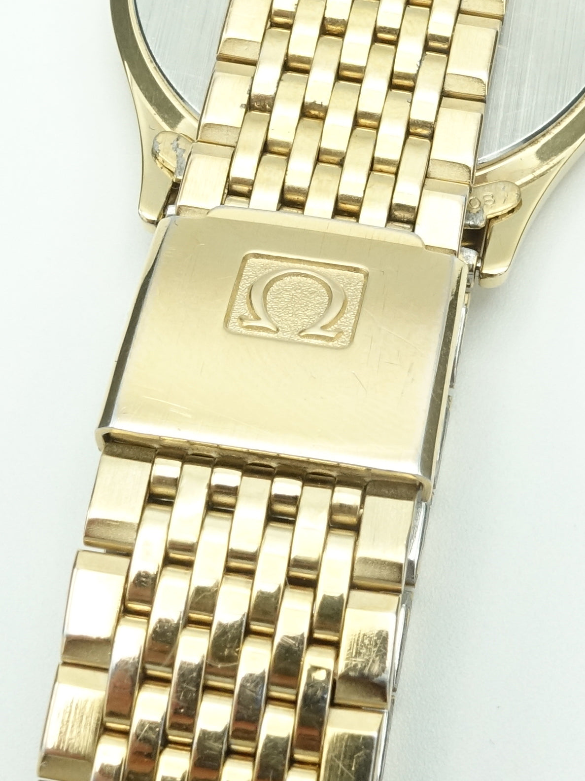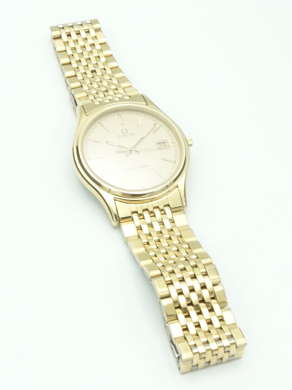 A dressier reference from Omega's flagship ‘Seamaster’ collection. This example has a stunning all gold colorway with a beautiful textured dial that needs to be seen in person to be truly appreciated. It also has its original Omega ‘beads of rice’ style bracelet which is iconic of its era. The calibre 1430 movement features a date complication and as with any Swiss quartz movement it’s extremely accurate and reliable.