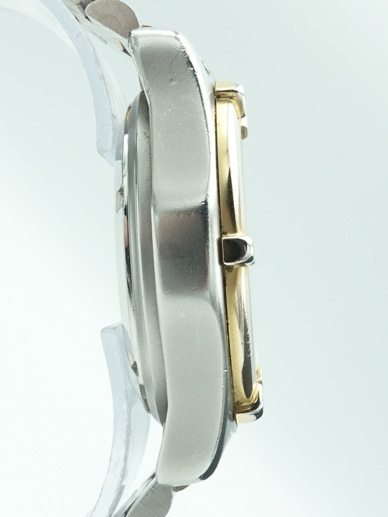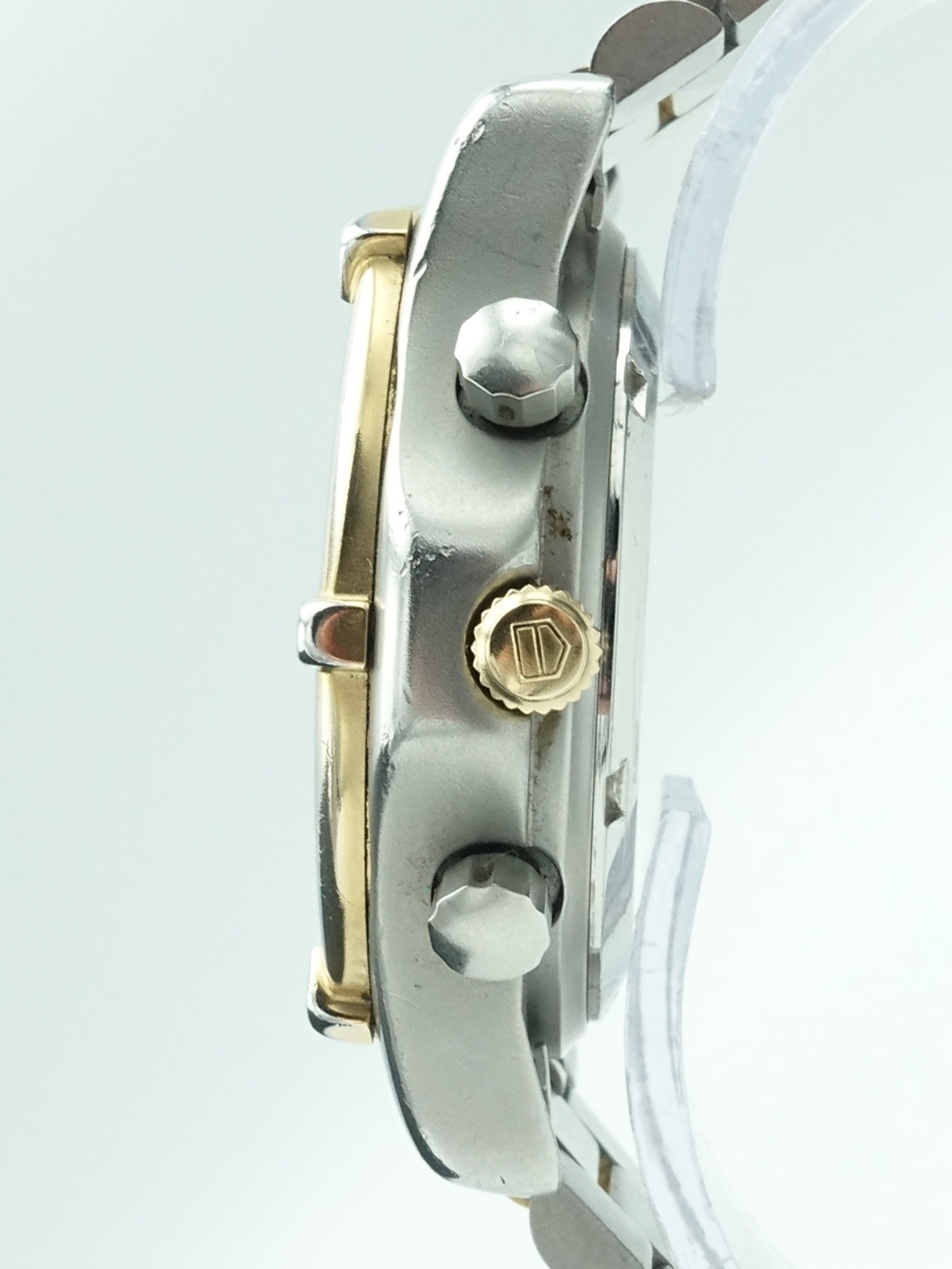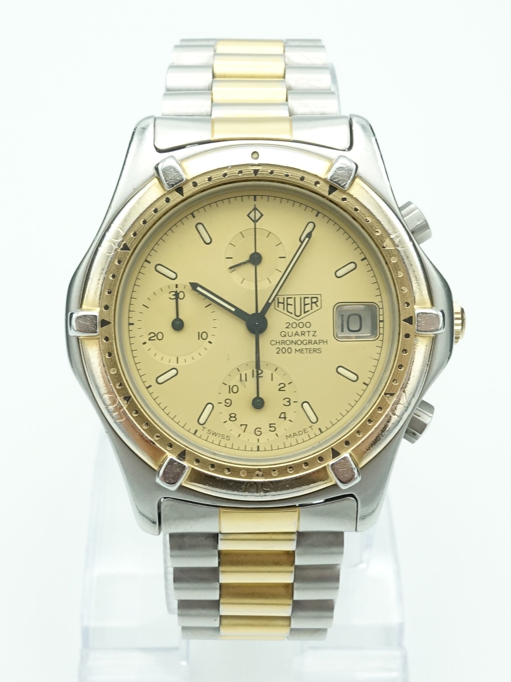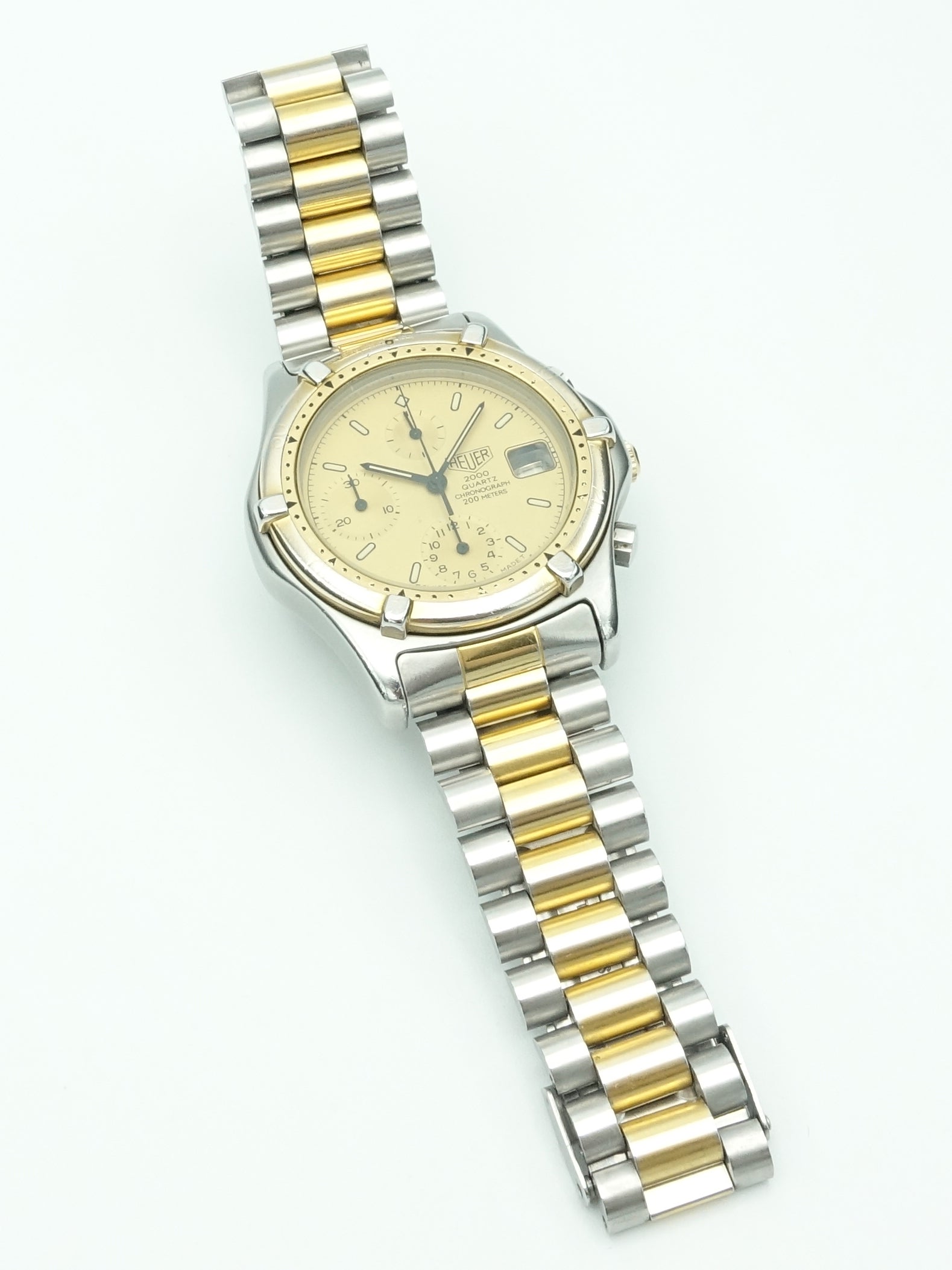 Following on from the hugely successful 1000 series Tag Heuer decided to keep a lot unchanged in the later 2000 series models. They did however decide to add complications and this particular reference is an example of a chronograph capable of being used by divers up to 200 metres depth. This particular reference is the stunning two tone example, with a gold dial and a gold metal bezel it really stands out on the wrist. It's also on its original oyster bracelet which became an iconic part of many dive watches. Internally it is powered by an in-house movement and as with any Swiss quartz it’s extremely accurate and reliable.